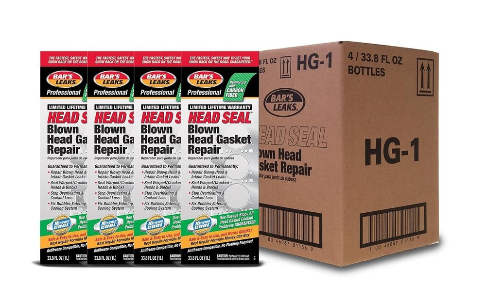 Bar's Leak HEAD SEAL Blown Head Gasket Repair - oz, Pack of 4 REPAIR BLOWN HEAD & INTAKE GASKET LEAKS: The fastest, safest way to solve your vehicle’s coolant-related head gasket issues. SEAL WARPED / CRACKED HEADS & BLOCKS: Your vehicle is a good candidate for this solution if it can idle for 15 minutes without overheating or having to add coolant. ANTIFREEZE COMPATIBLE, NO FLUSHING REQUIRED: Use with ALL types of 50-50 mix coolant including yellow, orange, pink, red, blue and green silicate based & non-silicate based (OAT / HOAT) antifreeze, and/or water. Unlike other products, no draining or thermostat removal is required. REINFORCED WITH CARBON FIBERS: Works with ALL gasoline and diesel engines. This also is the best additive to use in all racing applications. Bar’s Leaks Head Seal Blown Head Gasket Repair is the fastest, safest way to solve your vehicle’s coolant-related head gasket issues. Your vehicle is a good candidate for this solution if it can idle for 15 minutes without overheating or having to add coolant. Use with ALL types of 50-50 mix coolant including yellow, orange, pink, red, blue and green silicate based & non-silicate based (OAT / HOAT) antifreeze, and/or water. Unlike other products, no draining or thermostat removal is required. Works with ALL gasoline and diesel engines. This also is the best additive to use in all racing applications.