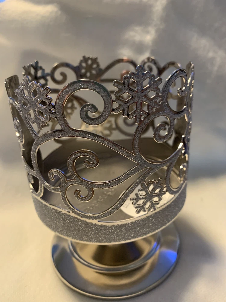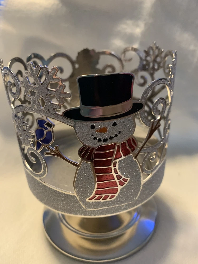 Bath and Body Works large holiday candle holder. Features a snowman on two sides. Silver with snowflakes throughout.