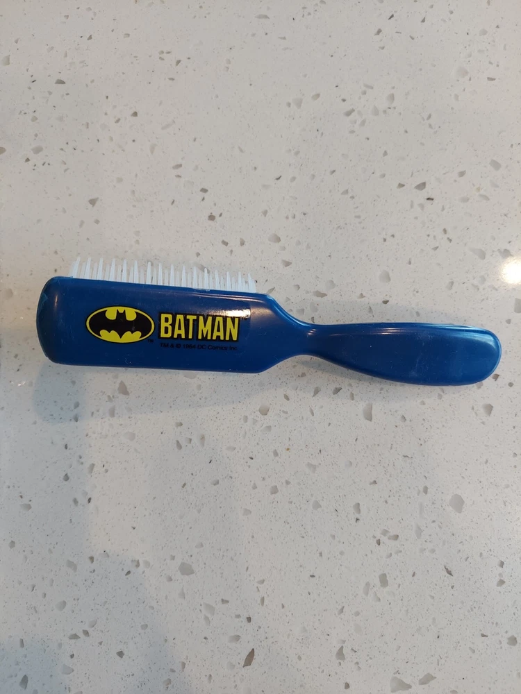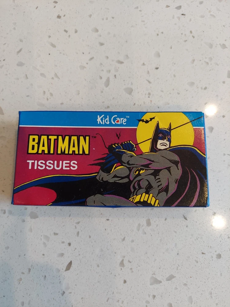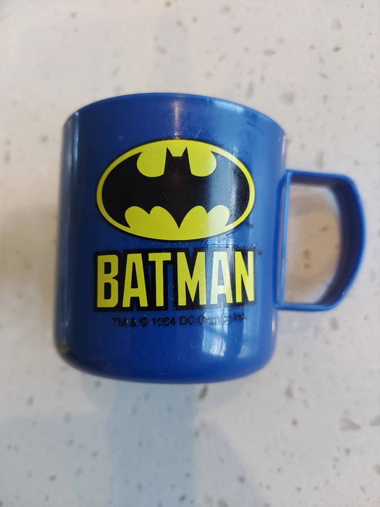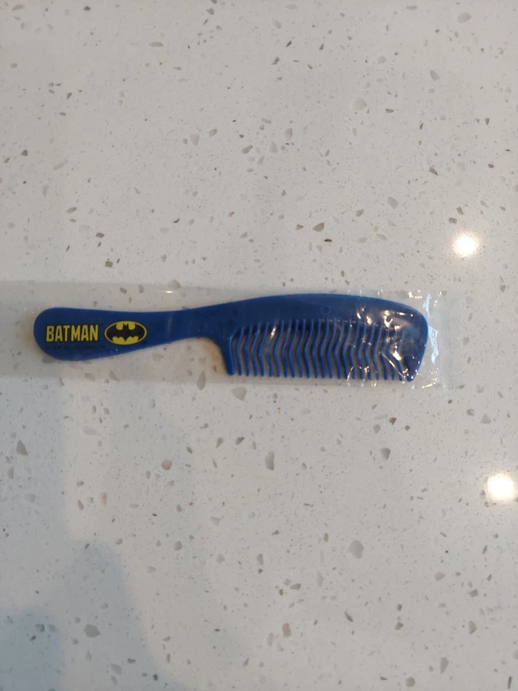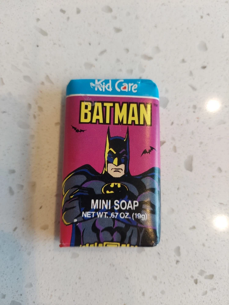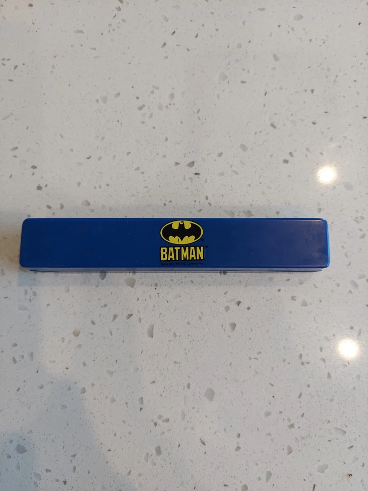 This Batman Kid Care Locker Bag from the 1990s comes with seven personal care items. The bag features the iconic Batman logo and is perfect for any young or more mature Batman fan. The included personal care items are a hairbrush, comb, soap, soap dish, tissues, toothbrush holder, and a cup. This handy locker bag is a must-have for any Batman fan.