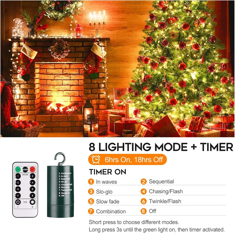 Store New Arrivals Add to Favorite View Feedback Contact Fast deliveries to the customer's home Quality customer service John Make the customers happy! Battery Christmas Lights with Remote, 66Ft 200LED Fairy Lights Battery Operated with Timer 8 Modes Waterproof for Outdoor Party Holiday Xmas Christmas Trees Decoration (Warm White) Description 66FT Green Wire String Lights: With a length of 66ft and 200 LED lights, the Christmas string lights provides ample coverage for any indoor or outdoor setting. The 1.64ft lead wire allows for easy installation and customization Auto Timer & Memory Function: The timer keeps 6 hours "On" and 18 hours "Off" once activated. Free your hands and save energy. Build in Memory chip save your last modes setting and no need to reset mode every day. 8 Lighting Modes and Auto Timer:Press the black button on the battery box to select the mode you want. Combination, In waves, Sequential, Slow Glow, Chasing/Flash, Slow fade, Twinkle/Flash, Steady on. To avoid forgetting to turn off the lights, you can set timer, the fairy lights will be 6 hours on and 18 hours off per day. Wide Application: This 200 LED mini lights gives off natural charming lighting, help you to create an amazing and romantic atmosphere in your home. Perfect for a foyer, bedroom,window,living room,camping,kids room,banister, balcony, deck, patio, yard, garden fence, centerpiece decor, oil painting, gallery, bistro, bar, restaurant, birthday, party, wedding anniversary, Outdoor & Indoor Christmas Lights: Battery box and string lights are waterproof(4*AA size battery, NOT INCLUDED), these are perfect to use on indoor and outdoor. Easy and great decor for Christmas tree, outdoor trees, wreaths and garland.These battery operated Waterfall cluster lights can keep flashing and shining during wet weather. Green Wire Christmas Tree Lights: Add a soft, festive glow to your decor with 100 LED Multicolor Mini Christmas Lights. Enhancing indoor and outdoor lighting in every holiday season. The total length of battery powered string lights is 33ft,suitable for Christmas trees from 6-51 feet. Item model number LLP-4AA-200 Light Source Type LED Number of Items 1 Power Source Battery Powered Number of Light Sources 200 Control Method Remote Theme Christmas Batteries Included? No Controller Type Remote Control, Button Control Batteries Required? Yes Material Plastic Seasons All Seasons Package Dimensions 6.38 x 3.62 x 3.62 inches Included Components 66ft Christmas String Lights and Remote Indoor/Outdoor Usage Outdoor, Indoor Country of Origin China Light Color White Water Resistance Level Waterproof Item Weight 12.3 ounces Occasion Christmas Special Features Timer Special Feature Timer Part Number LLP-100 Color Warm White Size 200LED with Remote ABOUT US We offer the best prices around on high quality products. Our E-store includes media such as books, movies, music and games while offering electronics, toys, sporting apparel, clothing, tools, general home, garden items and more. SHIPPING We are always working hard to ensure your package arrives as soon as possible. Please understand that some factors like weather, high postal traffic, and the performance of shipping companies are outside of our control. We offer free shipping to the lower 48 states and ship within 2 business days of payment, usually sooner. We do not accept P.O. Boxes. Please provide a physical address. For shipping outside of the continental USA, we only use eBay's Global Shipping Program. The item is shipped to KY and then sent to the rest of the world. International customers are responsible for all duties and taxes. Continue to 'check out' to calculate costs for shipping the item to your country. Messages regarding eBay's Global Shipping Program MUST be directed at eBay EXCLUSIVELY. RETURNS We offer a 30-Day Return Policy on items in which you are not completely satisfied with. You have the option of a full-refund or an exchange of the item. No returns are available on items shipped outside of the USA PAYMENT We accept PayPal. CONTACT US This page content is yet to come Please ad us to your favorite seller and visit again later Thank You CUSTOMER SATISFACTION We try our very best to make sure every customer is completely satisfied. If there's a problem, message us! We're happy to help. WE ACCEPT