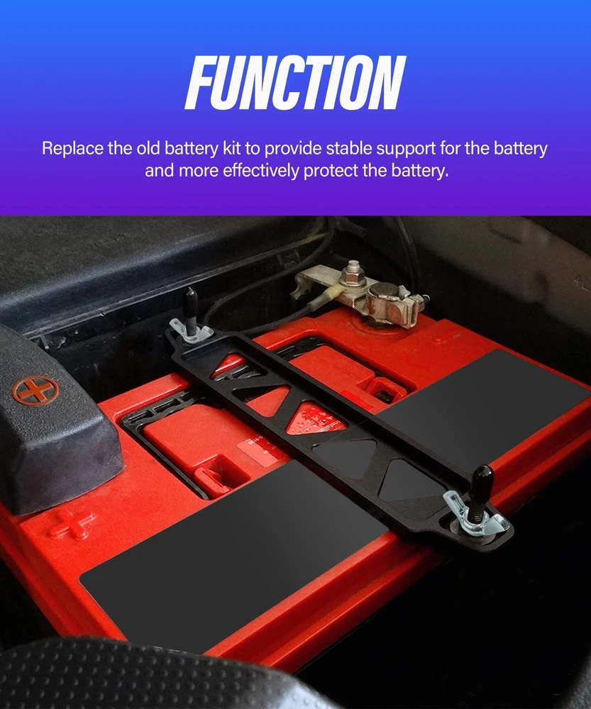 Battery Hold Down Bracket Holder [Package Includes] The package includes 1 battery mounting bracket, 2 10 inch J-shaped hooks, 2 sets of accessories (suitable for different installation types) -2 hexagonal and wing nuts, 2 rubber protective sleeves, 2 protective rubber washers, 2 spring lock washers, and 2 flat washers. [High Quality] The battery mounting bracket is made of high-quality aluminum alloy, which is sturdy, rust proof, and antioxidant. The side is designed with thickened aluminum alloy, which enhances the corrosion resistance and durability of the product. The surface of the bracket has undergone anodizing treatment, providing a long-lasting finish. [Size] The total length of this battery mounting bracket is 8.58 inches, and the distance between bolt centers is 7.48 inches. The bolt length is 250 millimeters and 10 inches. Please measure the diameter of the primary battery before purchasing to avoid purchasing products with incorrect dimensions. [Applicable] The battery fixing kit for automobiles is usually suitable for most groups 21, 21R, 22F, 22HF, 22R, 24, 24F, 24H, 24R, 24T, 25, 26, 26R, 26/70 27, 27F, 27H, 28, 29H, 30H, 31, 31A, 31T, 33, 34, 34R, 34/78, 35, 40R, 41, 42, 43, 46, 47, H6 (48), H8 (49), 85, 86, 90, 91, 92, 93, 94R, 95R, 96R, 97R, 98R, 99, 124, and 140R batteries. (Reminder: This type of fastening device is not suitable for some battery surfaces between raised ventilation caps) [Function] The battery fixing device aims to ensure that the battery is firmly fixed, with multiple colors available for selection, adding a beautiful and clean appearance to the engine compartment.