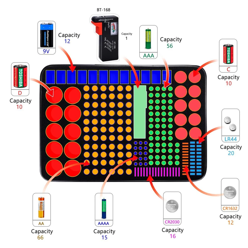 Battery Organizer Storage Box Hard 200+ Batteries - with Battery Tester BT-168,Carrying Case Waterproof Fireproof Bag AA AAA C D 9V 3V Holder FIREPROOF EXPLOSION PROOF WATERPROOF: Fireproof battery organizer storage box is made of high quality non-itchy silicone coated fiberglass which stands up the temperature up to 2000℉. Fireproof and explosion-proof materials will keep your batteries 100% safe. We designed this fireproof battery box to minimize the danger and loss caused by battery explosion.It will be an ideal great Chirstmas gift for your family or friends. For more type batteries: 13.4*9.5*3 inches size. It can hold 66*AA, 56*AAA, 10*C, 10*D, 12*9V,15*AAAA, 48*Button type batteries( 3V lithium - CR 2032,CR 2016,CR 1632, CR 2025,LR44. Duracell - 1616/ 2025/ 2032/ 2016), total over 220 batteries. Fireproof battery organizer bag also comes with two zippered pockets for easy storage of Battery Tester and other types of batteries(CR2,CR123A,23A), perfect for Energizer Alkaline Batteries, ACDelco, Panasonic, Duracell batteries. SAFELY STORES BATTERIES:Our fireproof battery organizer bag features a double zipper and durable handle to keep batteries from shock. In the event that a defective battery were to swell, leak, or explode our bag is designed to contain this and keep your family safe. Batteries are securely held in well organized foam cutouts,this prevents accidental contact between batteries from causing a fire or explosion, and it also makes it easy to find the right battery! SAFE & LIGHTWEIGHT & PORTABLE: Not only can you safely hang the battery bag on the wall, in the storage room, in the drawer or anywhere away from the fire, you can also take it to travel and various outdoor activities.Of course, giving it as a gift to your family, customers or employees is also a good choice.(The cut foam is retained inside,so it may take some time to remove it,but it won't deform the internal foam,which is why we designed this approach) Note - Includes a battery tester, Does NOT include any batteries. Our fireproof battery case has been tested by SGS (world's TOP test company), and met the highest requirement of UL94 VTM-0 Certified and ROHS IEC62321 Certified. If you have any issues or concerns please feel free to let us know, your feedback has a great impact on development of our products.