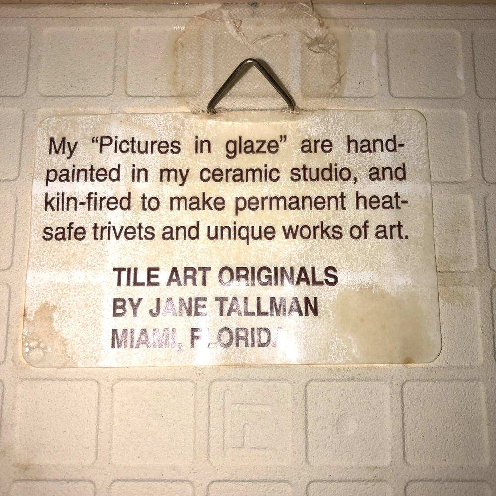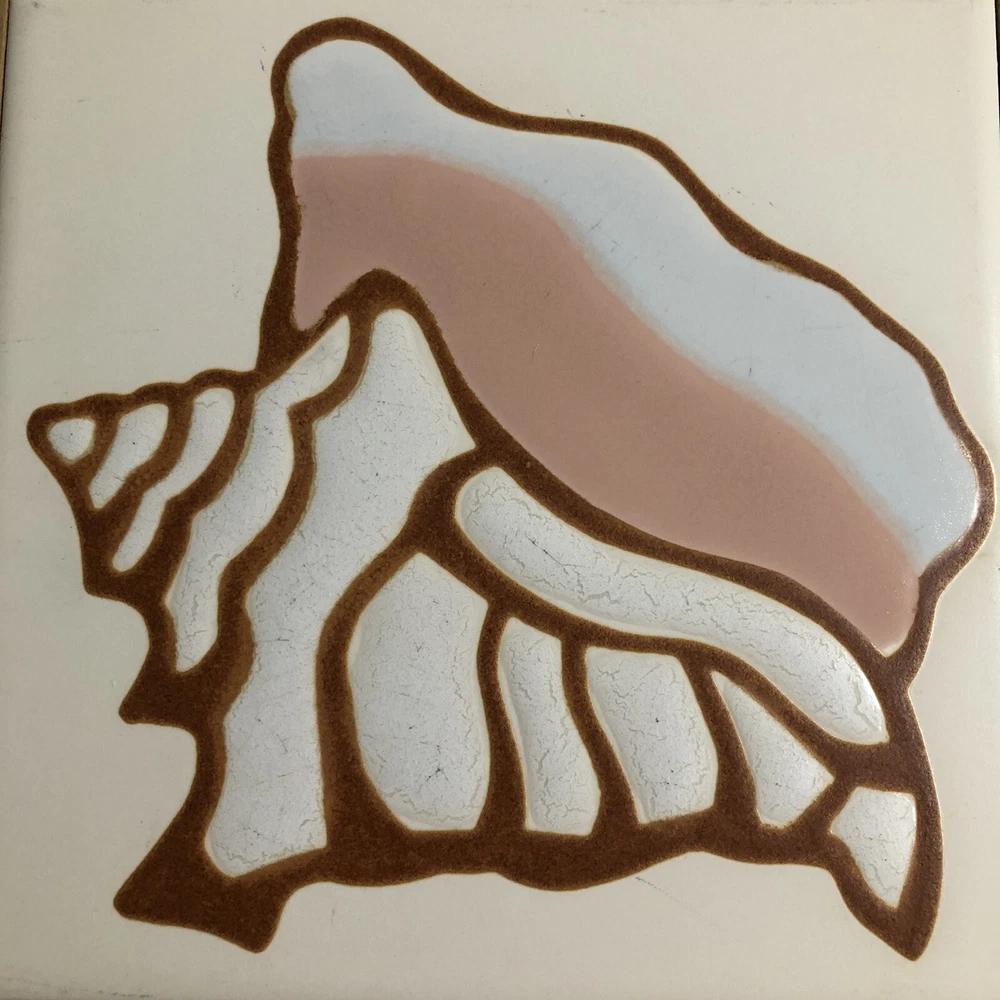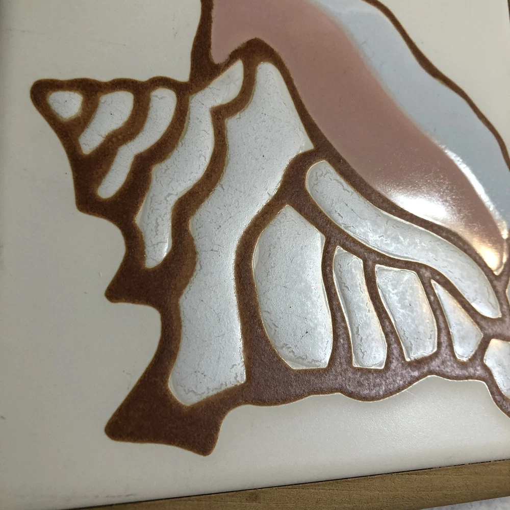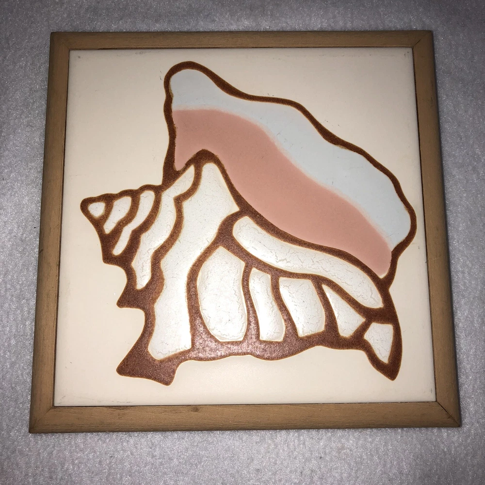 This is a beautiful Tile Art Originals by Jane Tallman of Miami Florida tile trivet. It has a Beach theme and features a Conch Shell. It is done in soft earth tone colors of beige, tan, white and pink. The trivet is encased in a wood frame. Could be used either as a wall hanging or as a hot plate/trivet. There is a hook on the back for hanging. It measures approximately 7 inches by 7 inches. Trivet is in good pre-owned condition. There are no nicks, chips or cracks. One of the small round cork feet is missing. Tile Art Originals sticker is still in place on the back side of the trivet. Please review all photos for additional details, views and measurements. Shipped via USPS Ground Advantage.