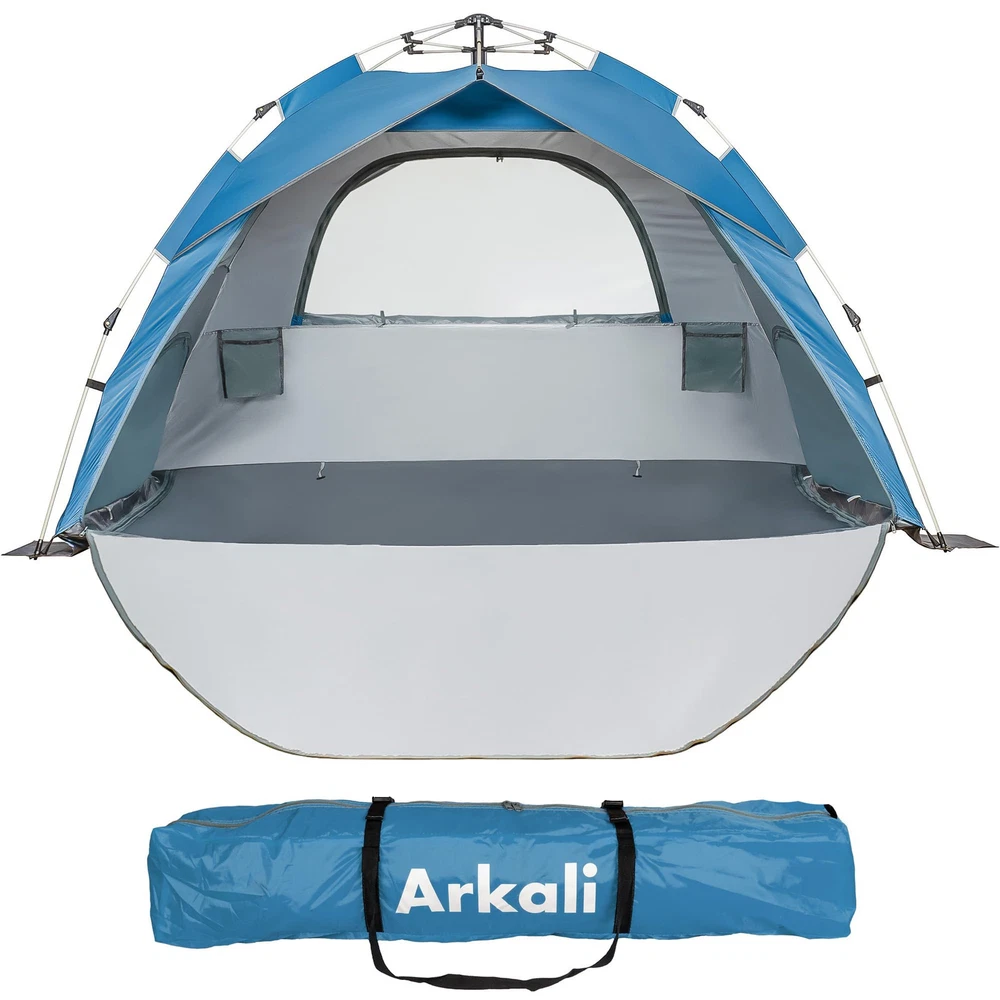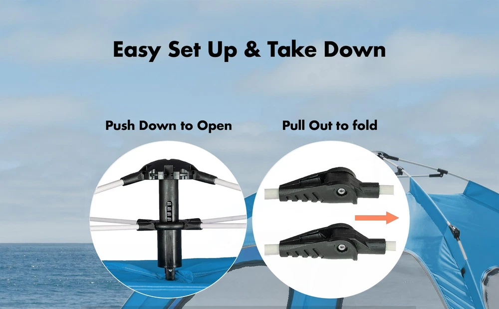 Sun protection: sun shade pop up and UV Guard fabrics Floor-less: no sunburn while enjoying hours of sand play and beach chairs will not be damaging the floor of this pop up beach tent sun shelter Privacy option: door and windows can be fully zipped up to instantly create privacy with this easy pop up beach tent sun shelter Great ventilation: air flow can be easily adjusted by simply unzipping the screens for the flaps and windows Large space: fits a regular family size of 3 to 4 people ; fully opened size L: 90-Inch W: 59-Inch H: 50-Inch Easy setup: sun shade easy pop up, it can be set up or taken down by 1 person
