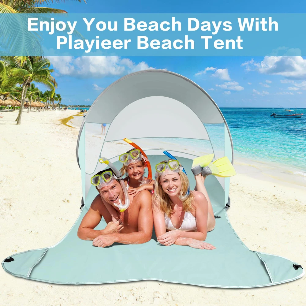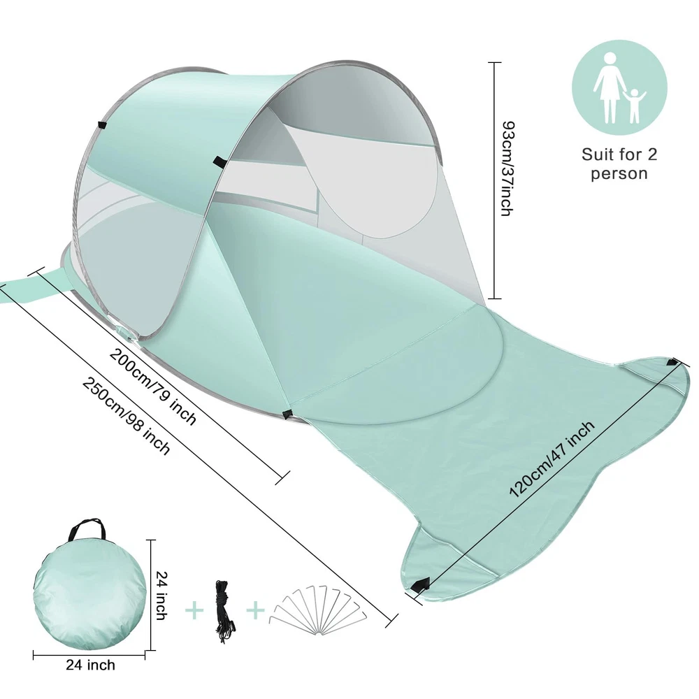 Portable & Larger Space: This beach tent is assembled in two parts and extended front floor provides extra space for more activities. The open size of sun shelter is 98 x 47 x 37 inches (L x W x H), comfortably fits 3—4 people. Lightweight at 4 lbs, packs down to 24" x 1" inches, easy to take down and fold back under 30 seconds, no need spending time & energy to build it up. pop up tent is the best choice to travel with. 360° Ventilation: Three large mesh windows with spacious entrance are enlarged to help air flow and widen your vision, allowing you to enjoy the sea breeze and playtime comfortably inside the beach shade. Excellent UV Protection: Beach shelter tent with eco-friendly silver coating that can be effectively blocks up to 98% of the sun's harmful UV rays, which providing all-day protection for you and your family. Water/wind-proof design makes it suitable for all your outdoor activities. Premium Material for Stability: The beach canopy sunshade is made of 190T polyester for long lasting performance, strong frame, not easily deformed and cracked, all while supporting the beach shelter tent securely, allowing it to stand by itself and keeps shape after long time use. 4 sand bags and 10 stakes are provided, allowing to form a stable structure with the sun tent, which further enhances the stability. Widely Use: Automatic instant tent is suitable for many occasions, it is not only appropriate to be used at the beach, but also perfect fit any activities at the park, backyard, fishing, playground, playgroups, sporting events, music festivals, weekend trip or children playhouse. The perfect ideas for birthday parties, picnics, carnivals and sleepovers.