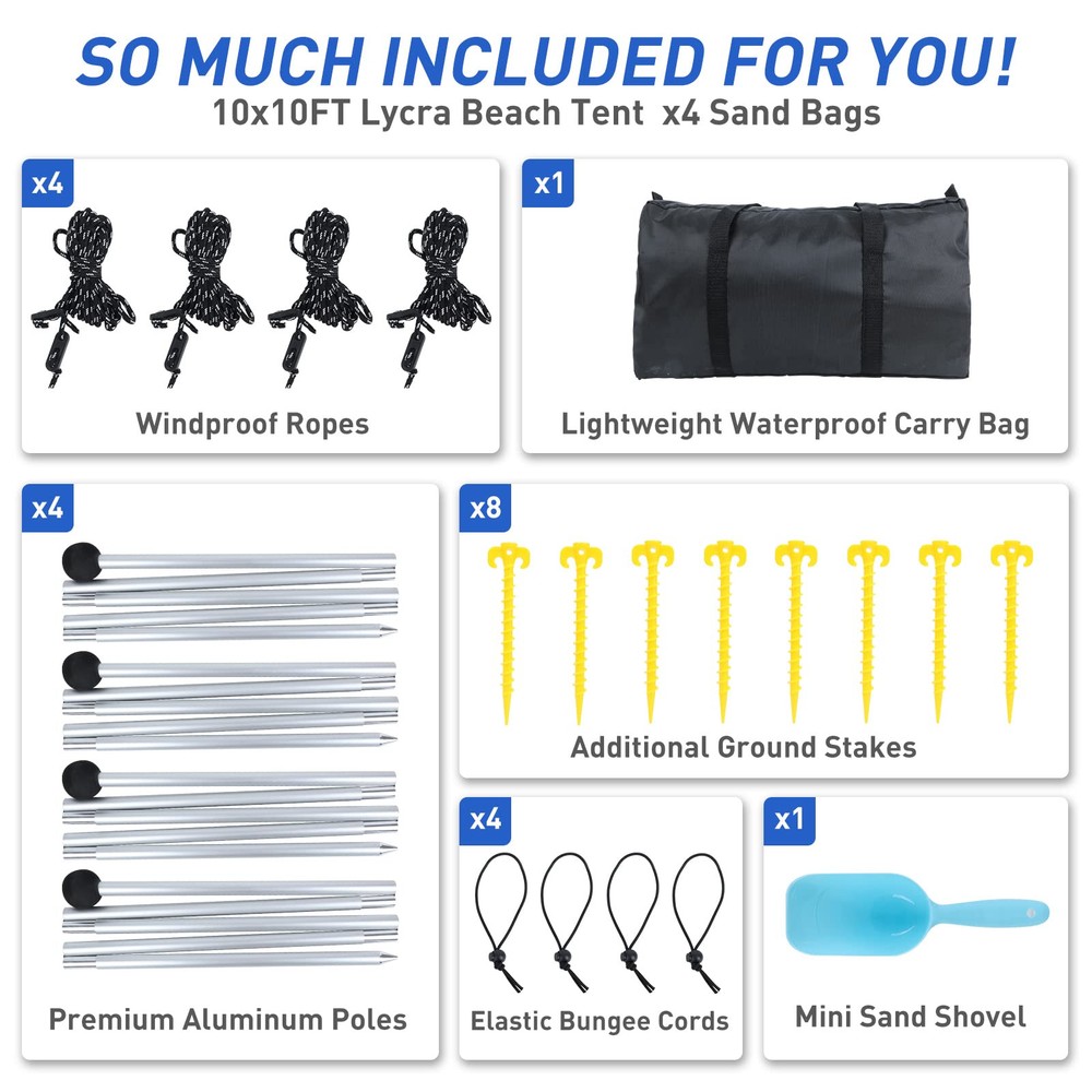 Large Family Sun Shelter - beach tent sun shade canopy's four 6.6FT tall aluminum poles keep entire canopy area stays at full height that increasing the shaded area by 50%.10x10FT is enough for 6-8 people. 7x7FT is enough for 3-6 people. It holds up well in the wind because of the extra big sand anchors and high quality rust-proof aluminum poles.Providing enough space for couples, families and friends' party. FOUR CONVENIENT FAMILY SIZES. Choose the ideal that works for your family needs Advanced Sun Protection - Our sun tents for beach and outdoor crafted with high quality elastic Lycra fabric, offering UPF 50+ sun coverage protection. Can block up to 98% of harmful UV rays, reduce sunburn or glare with protection coating making it ideal for kids or adults laying out. Superb shade windproof, water resistance beach sun cover keep you protected on both sunny and rainy days. Combined with excellent 4-sided ventilation performance enjoy the sea breeze in the shade of the beach Quick and Easy Outdoor Setup - Each beach tent comes with stability poles, anchors and windproof ropes that let you use it over sandy beaches,thick grassy areas, or even in rocky camping spots. Equipped with sand shovel to quickly hold large amount of sand to anchor and overfill all 4 sandbags.Foldable thickened rust-resistant aluminum poles has a pointed stake at the bottom can stick them straight into the sand or ground.The sturdy EVA foam ball on top of the poles won't tear the fabric Easy Assemble and Portable - Prepare the beach tents sun shelter pop up in a matter of minutes. Just stretch out canopy and fill flarge sand anchor fully, use the foldable pole to support the tent. Secure the fabric on the EVA ball with bungee cords and pull tight. Pull sandbags away to tighten structure. If needed, bury sandbags and use the ground pegs to add windproof ropes. And when the trip is over, you can easily take it off. The easy-to-carry waterproof travel bag weighs only 6.5 pounds! All-Purpose Pop Up Beach Tent - For family trips to the beach,weekend tailgating party or summer camping picnics,cool beach umbrellas for extra enjoyment on hot days. Comes with a portable storage bag easily accommodates Lycra canopy,folding aluminum poles,tent pegs,elastic cords,sand shovel etc. you can popup almost anywhere. This portable pop up beach tent sun shelter can become your go-to companion when going to the beach, camping,park,picnic party,fishing backyard barbecue or music festival!