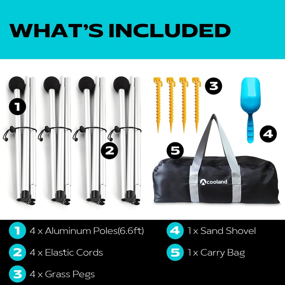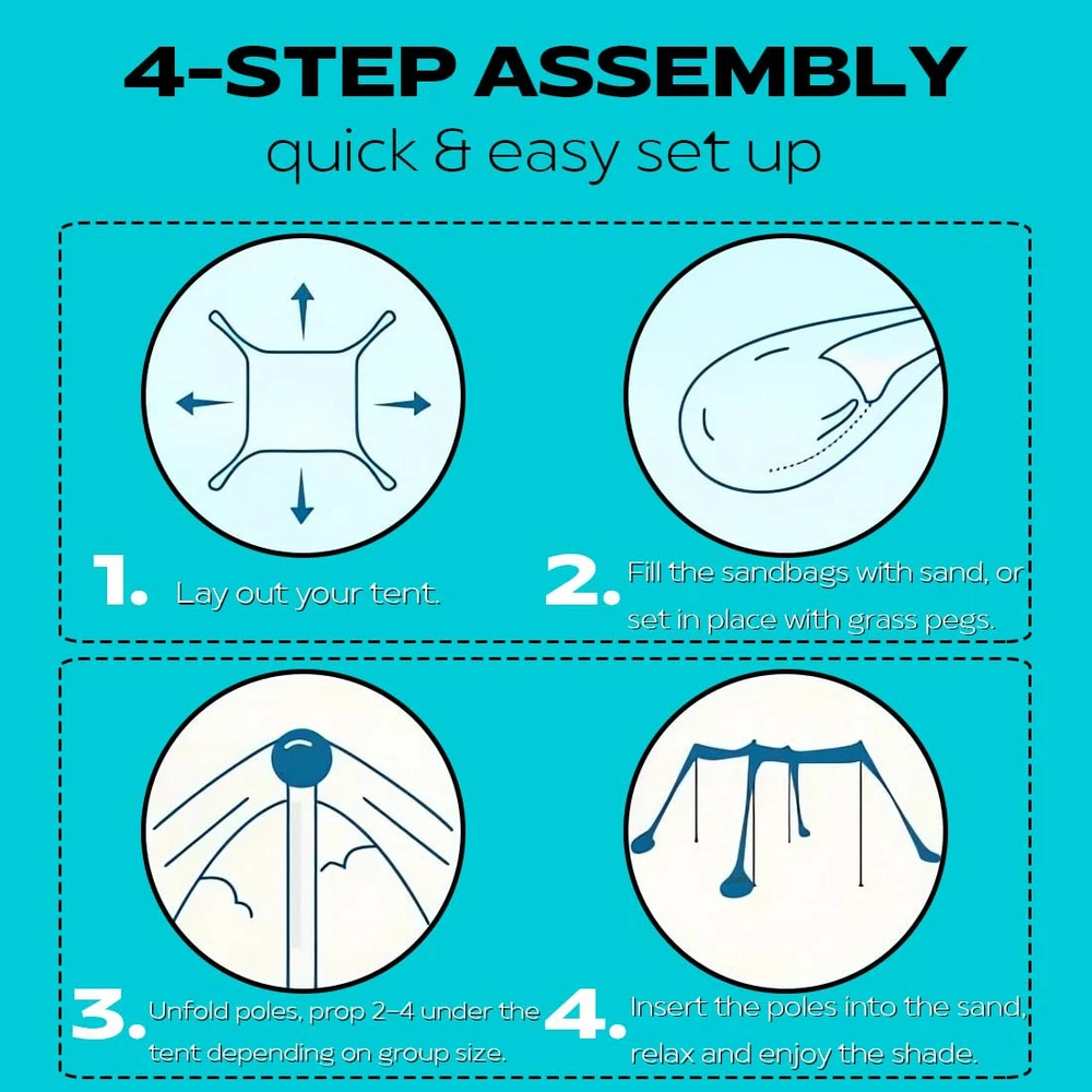 【Large Size Beach Canopy】- beach tent sun shelter is 10x 10 ft, with 4 aluminum poles up to 6.6 ft in height, which can hold up to 8 people for beach party or outdoor picnic. Your home base will become the most coveted spot on the entire beach 【Quick and Easy Setup】- Beach shade canopy can be set up by a single person within 5 minutes. Simply lay it flat, fill the bags with sand, pull the bags apart to make a large "X," and prop up your tent with 2-4 poles 【Portable and Lightweight】- Weights 8 lbs and comes with a long-lasting nylon travel bag. Whether you're flying to a coastal paradise, camping, or fishing trips, you'll have no problem packing your pop up beach tent 【Advanced Sun Protection】- Designed with the high stretch Lycra fabric and offering UPF 50+ sun coverage and water-resistant function, lightweight beach tent pop up shade can shade your outdoor beach holiday. Family beach tent durable materials are not afraid of stretching and tearing 【Stable Windproof Performance】- Fill the sandbag with sand or stones as much as possible which makes this portable beach canopy has better wind resistance. You use beach shade tent over sandy beaches, thick grassy areas, or even in rocky camping spots