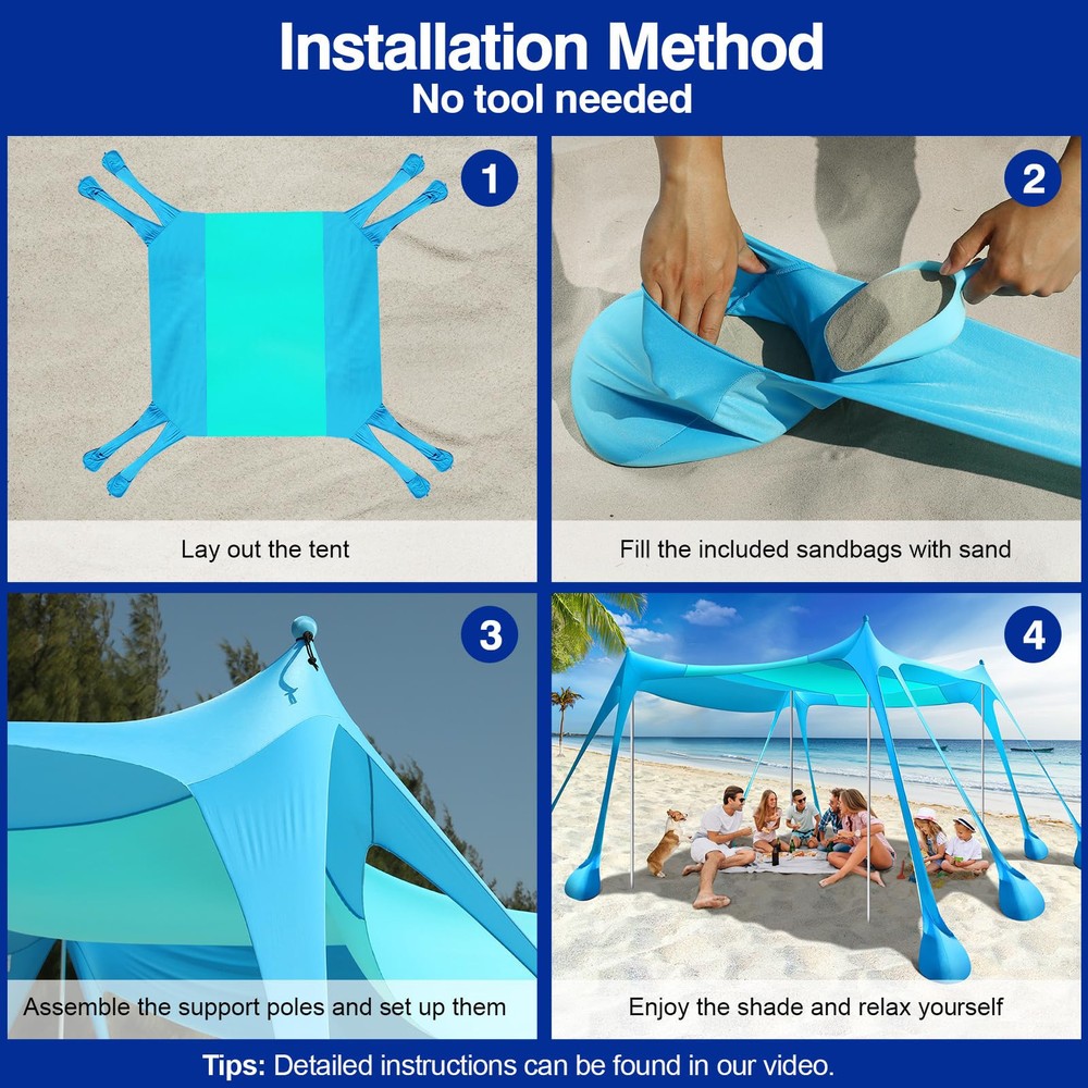 【Stands up to High Wind】Our upgraded beach tent sun shelter is equipped with 8 sandbags, 4 thickened aluminum poles and 4 windproof ropes, strong enough to withstand high beach winds, ensure stability and prevent collapse. 【UPF 50+ Sun Protection】The beach shade canopy fabric provides UPF 50+ sun protection to block harmful UV rays and protect your skin from sunburn on the all-day beach trip. Let the beach sun shade do the shading. 【Spacious Space】The large family beach canopy features two sizes 7.5*7.5ft and 10*10ft, both 6.5 ft high, increasing the shaded area and providing a sun shade place for 4-person, 6-person, or 8-person as well as chairs, towels, and coolers. Ventilated on all sides, our beach tent canopy is an ideal choice for an outdoor beach, kicking and fishing. 【Quick and Easy Setup】It only takes a few minutes to set up and take down. Spread it out, then fill the sandbags, and add the poles. The included sand shovel is a nice bonus to fill 8 sandbags. Burying sandbags into the beach will make beach shelter more stable. One person can do it, making the outdoor beach day so easy and comfy! 【sturdy Fabrics】Our beach canopy tent is made of Lycra fabric with triple stitching for tensile strength and can prevent tearing for long-term results. The vivid color is vibrant and unique on the beach. Hand washing or machine washing makes cleaning easier. 【Light and Portable】This beach sun shade canopy is equipped with sturdy storage bag. Unpack pop up beach tent, fold it up and put it in the bag, you can effortlessly take it to any holiday area such as the beach, grass, patio, or campsite to enjoy the shade.