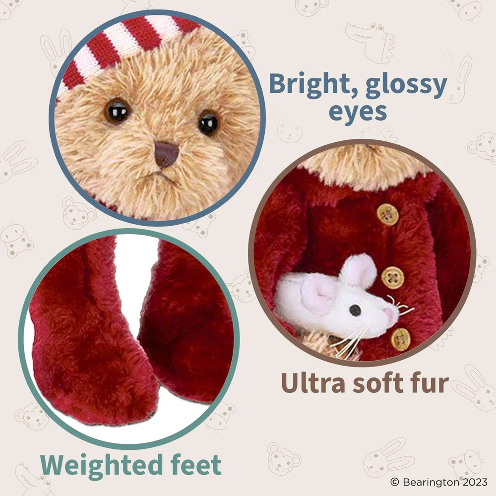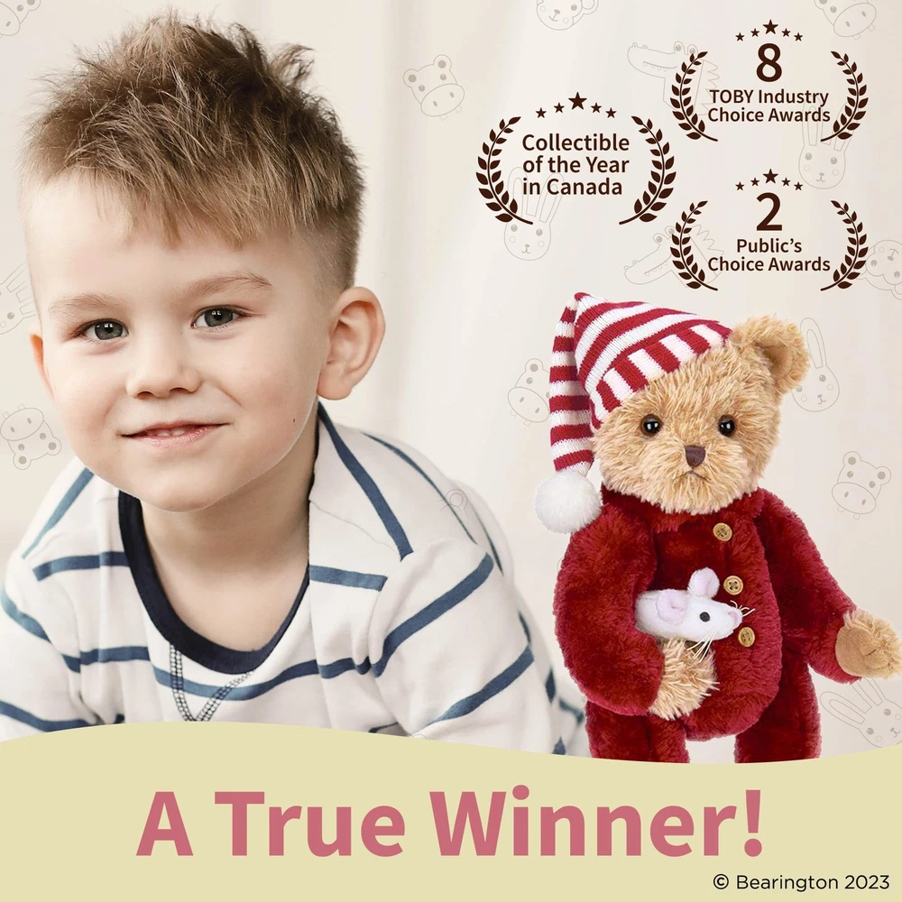 You will love the fine detail award winning Bearington Collection uses to bring Sleepy & Squeek, the Twas the Night Before Christmas themed teddy bear, to life. Hand crafted using the most luxurious, soft plush, this bear makes a special gift or a great addition to your holiday décor. Soft and pose-able, Sleepy & Squeek is perfect for anyone from a collector to a special child in your life. Measures 14" tall when standing. Founded in 1997, Bearington is the proud recipient of more distinguished design awards than any other teddy bear company. Over the years, Bearington has received more than 100 industry design awards and nominations which include: 1 Canadian Collectible of the Year Award, 2 NALED Plush of the Year Nominations, 2 CIB Collector’s Choice Awards, and several TOBY Industry Choice Awards, TOBY Public Choice Awards, and Golden Teddy Awards and Nominations. CHRISTMAS CLASSIC: Illuminate the festive spirit with our Christmas Classic, a 14” tall adorably cute teddy bear. Inspired by 'Twas the Night Before Christmas, this holiday bear is garbed with a red and white knitted nightcap, keeping the holiday vibe alive. A delightful gift to treasure, our Christmas teddy bear comes with a lovable mouse buddy. Its surface is washable, making it easy to clean. Touch, hug and savor the season's joy with our Christmas bear! COLLECTIBLE QUALITY: Handcrafted with high-quality premium materials, this bear exudes an unrivalled softness ideal for snuggly winter nights. As a treasured element of annual holiday traditions, this Christmas Bear captivates not just as a toy, but as a magnificent collectible. Our Holiday Bears collection signifies excellent workmanship made to make your Christmas magical and memorable. POSABLE: This unique holiday bear is not your typical Christmas stuffed animal. It features jointed arms, legs, and a head, enhanced by a bean bag weight, rendering it fully posable - a charming trait that sets it apart! Crafted to spread Christmas cheer, this endearing Christmas bear holds the magical wonder of the holiday season. Snuggle-ready and heartwarming, this posable bear makes for a perfect Christmas gift, infusing homey holiday spirit into your festive celebrations. SPECIAL GIFT: Discover the magic of Christmas with our enchanting Christmas Teddy Bear. This holiday bear is more than just a plush toy - it's a huggable, lovable addition to your Christmas décor and a perfect stocking stuffer. Ideal for bear collectors, children, or anyone who appreciates the joy of the season. Our Christmas Stuffed Animals make memories, start traditions and spread holiday cheer. Give the gift of cuddles and warmth this season with our adorable Holiday Bears. AWARD-WINNING TOYS: Experience the magic of Christmas with Bearington's award-winning, children's favorite plush toys. Celebrating over 25 years, we're excited to introduce our 2023 enchanting Christmas line. Featuring adorable Christmas stuffed animals for kids, such as the rosy-cheeked snowman toy and the always-loved Christmas bears. Our Bearington Christmas plush collection brings festive charm, creating soft, enduring memories with our cuddly snowman plush and bear toys.