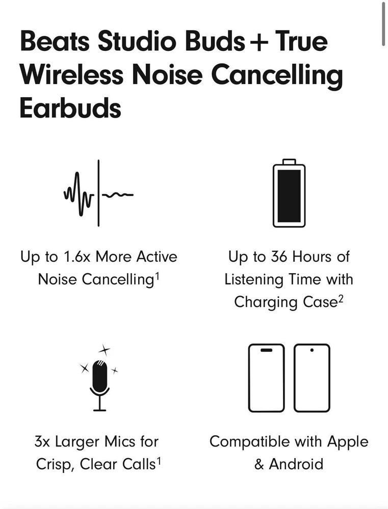 Beats Studio Buds – True Wireless Noise Cancelling Earbuds Clear / OPEN BOX LIKE NEW CNDITION 100% AUTHENTIC BEATS ALL SERIAL NUMBER HAS BEEN RECOREDED IN OUR STORE Included Items BEATS BY DR. DRE - BEATS STUDIO BUDS + TRUE WIRELESS NOISE CANCELLING EARBUDS - TRANSPARENT Beats Studio Buds + deliver rich, premium sound in a pocketable design, wherever you go. Featuring powerful, balanced acoustics, Active Noise Cancelling, Transparency mode, high-quality calls, up to 36 hours of battery life¹, enhanced Apple & Android compatibility, and 4 ear tip options to ensure a custom fit and great sound Beats Studio Buds + Earbuds Pocketable charging case Eartips with four size options USB-C to USB-C charging cable Quick Start Guide Warranty card Features Feel the emotion of powerful, balanced sound from Beatscustom acoustic platform Active Noise Cancelling (ANC) adapts to your personal fit to keep you immersed in the music Transparency mode blends your listening experience with the world around you Up to 36 hours of total battery life (9-hour earbuds + 27-hour charging case)¹ Enhanced Apple and Android compatibility with one-touch pairing and deeper ecosystem integration² Crisp, clear call performance from upgraded, voice-targeting mics Sweat and water resistant earbuds (IPX4-rated)³ Four soft eartip sizes provide a comfortable, stable fit and an acoustic seal for great sound quality Spatial audio for Dolby Atmos surrounds you with sound Extended range and fewer dropouts with Class 1 Bluetooth® Pocket-sized charging case with USB-C connector ¹ Testing conducted by Apple in March 2023 using preproduction Beats Studio Buds + and Charging Case units and software paired with iPhone 13/iPhone 14 units and prerelease software. The playlist consisted of 358 unique audio tracks from the iTunes Store (256-Kbps AAC encoding). Volume was set to 50% and Active Noise Cancellation and Transparency were turned off. Testing consisted of full Beats Studio Buds + battery discharge while playing audio until the first Beats Studio Buds + stopped playback. Battery life depends on device settings, environment, usage, and many other factors. ² Requires an iCloud account and a compatible Apple device running the latest operating system software or a compatible Android device running Android 8.0 or later, with Google Play Services enabled. ³ Beats Studio Buds + are sweat and water resistant for non-water sports and exercise. Beats Studio Buds + were tested under controlled laboratory conditions, and have a rating of IPX4 under IEC standard 60529. Sweat and water resistance are not permanent conditions and resistance might decrease as a result of normal wear. Do not attempt to charge wet Beats Studio Buds +; refer to https://support.apple.com/en-us/HT209542 for cleaning and drying instructions. The charging case is not sweat or water resistant. Compatible hardware and software required. Works with compatible content in supported apps. Not all content available in Dolby Atmos. Specifications True Wireless: true Battery Life Provided by Charging Case: 27 hours Sound Isolating: true Built-In Microphone: true Battery Life: 9 hours Water Resistant: true Wireless Connectivity: Bluetooth Connection Type: Wireless Manufacturer's Warranty - Labor: 1 year Manufacturer's Warranty - Parts: 1 year Rechargeable: true Model Number: MQLK3LL/A Color Category: Clear Headphone Fit: In-Ear Carrying Case: true Charging Accessory Included: Case Works With: Siri Product Name: Beats Studio Buds + True Wireless Noise Cancelling Earbuds Charging Interface(s): USB Type C Ear Tip Sizes Included: Extra small, Small, Medium, Large Brand: Beats by Dr. Dre Color: Transparent Noise Cancelling (Active): true