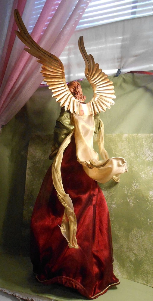 Beautiful Large 28" Nativity Set - Silk, Velvet, Enameled Tin from Philippines Rare large set of Nativity figures made of an enameled tin with weights inside. They are lavish with velvet, silk, and gold accents. Angel is 28" tall to her head or 43" tall to tip of her gold tin wings. The other figures are 21" tall. The angel has a "Philippines" label on the bottom. They are in very nice condition with the exception of a few enamel rubs on the bottom of the Angel and one of the kings. Due to the size and weight of the box shipping is $35.00. I will refund you if it comes to less. I also except pickup.