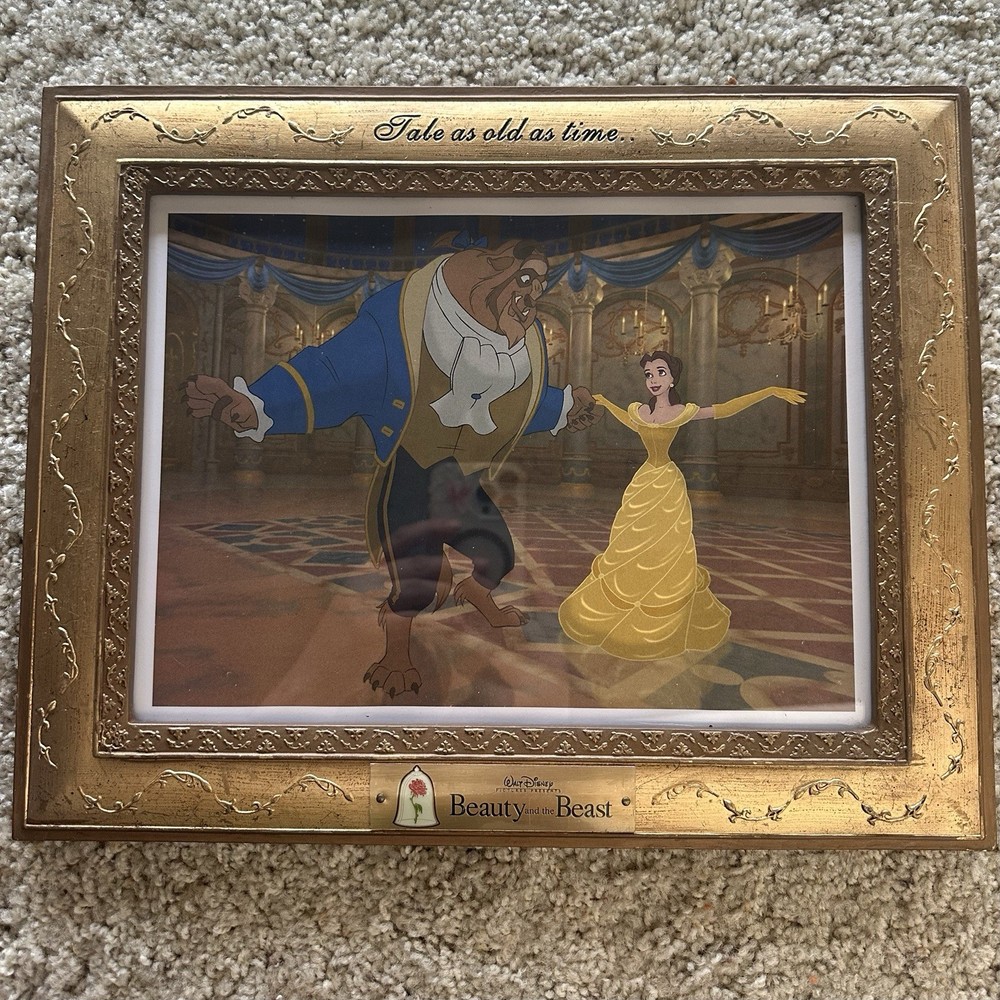 Beauty and the Beast Framed Lithographs Disney Princess Belle Set of 4 Wall Art / Prints Tale As Old As Time each frame measures 11.5" x 14.5" Frames are a nice solid / sturdy gold material with hanging chain solidly attached to back Media Room Art / Nursery Art / 1990s Disney Movie Memorabilia / Classic - smoke free home - packaged with care - offers welcome - i will ship out within 2 business days