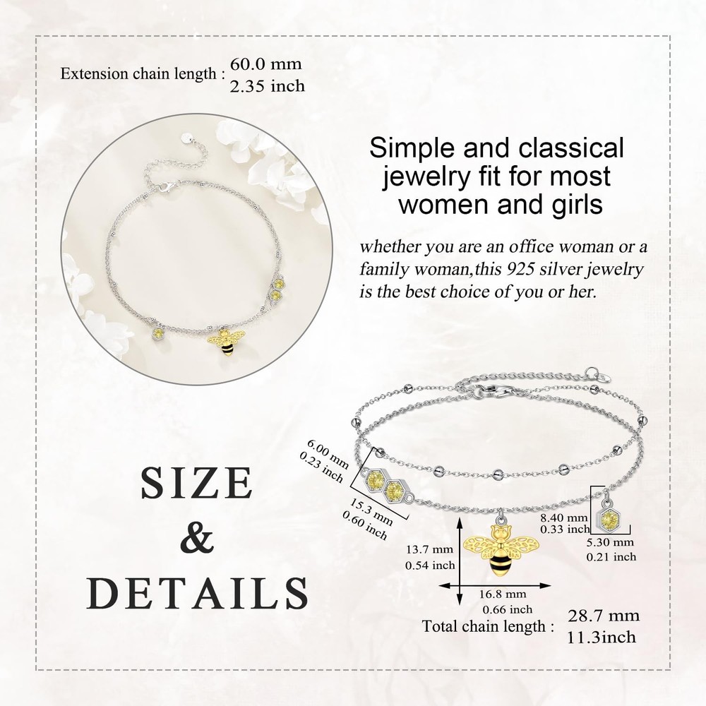 đăBumblebee AnkletăLayered anklets are a must-have for beach and seaside wear, you can wear them alone or stack them with other anklets. Bumblebee Women's Style. Shiny zircon embellishments add visual highlights, making the overall look more eye-catching. đăBee Bracelet MaterialăThe Bumblebee Anklet is exquisitely crafted and made of pure 925 sterling silver. 14K gold-plated, rust-proof, ensuring comfortable wearing and long-lasting shine. đăAdjustable Ankle Braceletă9 inches + 2 inches extension. The anklet length is adjustable, suitable for women of different ages. You can adjust the length freely. đăBee Jewelry GiftăThis beautiful bee anklet is the perfect accessory for any time. A sweet gift for women, friends, girlfriends, wives, sisters, mothers, grandmothers, etc. Christmas gifts, Valentine's Day gifts, Mother's Day gifts, birthday gifts, anniversary gifts. đăCustomer ServiceăEquipped with a beautiful gift box, no need to worry about packaging! If you have any questions, we will solve your problems within 24 hours.