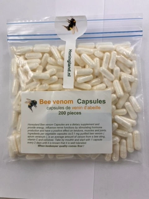 Bee Venom Capsules, Capsules de venin d'abeille, Bienengift Capsules, Bee Venom Capsules. Bee venom gives energy, influences nerve functions and has a positive effect on muscles, tendons and joints. The effect on the nerves is caused by the stimulation of hormone production by the adrenal cortex. The effectiveness is comparable to that of foods with active ingredients, such as coffee. Too much of it can lead to insomnia, heart palpitations, too much or too little urination. Bee venom is not recommended for diabetes and kidney disease. In Europe, the ingestion of bee venom for therapeutic use has been known since the mid-19th century. It was then mainly used in homeopathy. However, bee venom has been used in folk medicine for much longer in the form of bee decoctions and powdered bee stings. Bee venom tablets were first produced in the 1960s, but were never marketed. Compound: Components of bee venom are mellitin (40-60%), phospholipase A (10-12%), apamine (2-3%), MCD peptide (2%), histamine (1%) and many other substances such as pamine, secapin , hyaluroidase, acid phosphomonoesterase, lysophospholipase and glucosidase. Before the poison is processed in food supplements and personal care products, the liquid poison is dried and purified. Allergy: Allergy to bee venom in capsule cream is very rare and, to our knowledge, undocumented. However, when injecting bee venom through a bee sting, there is a real risk of an allergic reaction. This is mainly caused by the glandular fluid in which the poison is dissolved and not by the active substances. Keep bee venom out of the reach of children. DO NOT use bee venom if you are allergic to any of the listed ingredients. DO NOT exceed the recommended dose. Bee venom is not intended to treat or cure any medical condition. Bee venom capsules. Bee venom capsules can be regarded as a dietary supplement. They contain a minimal amount of purified bee venom, which can be taken by mouth. One capsule contains 0.1 mg of purified bee venom, (Apium venenum) from honeybees (Apis mellifera) + vitamin C (Ascorbic acid). This amount corresponds to the average amount of venom of a natural bee sting and is referred to as 1 sting equivalent. By taking this dietary supplement you get the amount of venom from a bee sting. Other ingredients are vitamin C and cellulose. The capsule itself is made of cellulose (Vegan). Effect of vitamin C. Vitamin C is perhaps the most famous vitamin, best known for the discovery that extreme vitamin C deficiencies lead to the disease scurvy, notorious a few centuries ago among sailors who stayed at sea for a long time. This was due to long-term shortages of fresh fruit and fresh vegetables (rich in vitamin C). The name Ascorbic acid (the scientific name of vitamin C) is also derived from this discovery: “a-scorbut” means “against scurvy”. Today we know that vitamin C is the most important water-soluble anti-oxidant and as such plays a major role as a scavenger of free radicals. In this capacity, it is involved in protecting the body against oxidative damage and thus contributes to the maintenance of healthy cells and tissues. In addition, vitamin C is required as a coenzyme for various enzymes involved in the production of collagen. This important building block is important for healthy blood vessels, gums, bones, cartilage, among other things. Skin and tendons. Permitted health claims of vitamin C: The science about vitamin C is so convincing that the following health-promoting effects of vitamin C have been officially approved according to new European regulations: Vitamin C contributes to the protection of cells against oxidative damage. Vitamin C contributes to the formation of collagen and therefore supports a good condition of blood vessels, bones, cartilage, skin, gums and teeth. Vitamin C contributes to the regeneration of the reduced form of vitamin E. Vitamin C is important for the absorption of iron from plant sources. The total weight of the capsule with contents is approximately 325 mg. It is advisable to start with one capsule every other day until it is ensured that it is well tolerated. In case of unwanted side effects, a doctor should be consulted. Most people only experience an effect with one or more capsules per day. After three weeks, you can stop for one or two weeks, as is also recommended in bee sting therapy (BVT).