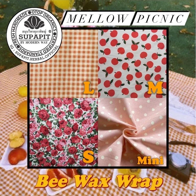 Bee's Wrap Organic Reusable Coconut Oil-Infused Beeswax Food Wraps ( Mellow Picnic design ) đ Bee's Wax Food Wrap is a sustainable, eco-friendly alternative to plastic wraps, crafted from 100% cotton fabric infused with food-grade beeswax, pine resin, coconut oil, and jojoba oil. This wrap is soft, flexible, and molds easily to cover various containers, preserving the freshness of food while being kinder to the environment. Features and Uses: Reusable for up to 2-3 years, can be easily washed with mild soap and cool water. Wraps bowls, plates, and other containers or can be folded to hold cookies, fruits, vegetables, cheese, and sandwiches. Perfect for preserving cut fruits and vegetables or bread, ensuring they stay fresh. Versatile use: doubles as an organizer for small items like cosmetics, earbuds, jewelry, or bag dividers, simplifying storage and organization. Instructions for Use: Warm the wrap with your hands to soften the wax before wrapping around containers. Clean with cool water and mild soap; avoid hot water, microwaves, and wrapping hot items. Store by folding or rolling in a drawer; to extend life further, store in the refrigerator when not in use. Warning: Some wax may naturally transfer onto your hands or containers; itâs food-grade and safe. The wrap adheres best to glass, ceramic, plastic, or metal surfaces. Available Sizes (1 Limited Edition Set): L: 30x30 cm (12x12 inches) M: 25x25 cm (10x10 inches) S: 20x20 cm (8x8 inches) Mini: 15x15 cm (6x6 inches) Support our eco-friendly initiative to reduce plastic wasteâjoin us in making sustainable choices with Supapit Herbalâs Bee Wax Wrap! Payment - Payment managed by eBay and accept only Payoneer - Your satisfaction is my goal. If you're not satisfied with the item you purchased, please contact me before leaving a feedback Shipping - The package will be shipped directly from Thailand via Standard E-Package Airmail, Free tracking number is included. - Items will be shipped within 5 business days after receiving your payment. - Delivery will take approximately 14-28 business days. Contact - If you have questions, feel free to write me on e B a y message.