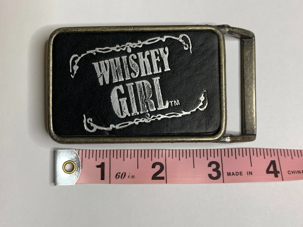 Vintage Whiskey Girl Belt Buckle Black Leather & Silver Buckle Western 2”x3.5”. Made in Canada