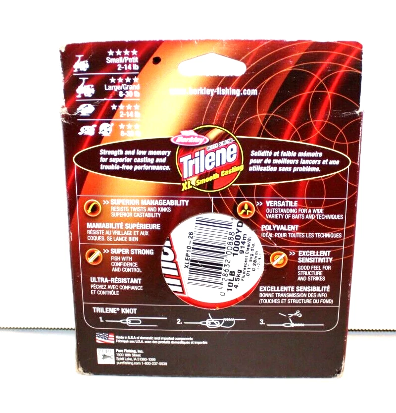 Berkley Trilene XL Smooth Casting 10 LB 1000 Yard Fishing Line 4.5kg 914m Berkley's Trilene XLSmooth Casting Line is an excellent all-purpose mono line that combines incredible handling with exceptional strength for trouble-free fishing. Famous for its super limpness, low memory, smooth handling and toughness, this easy casting Trilene XL Line's unique formula also ensures less line twisting, fewer kinks, minimal backlashes and superior abrasion resistance. Incredible handling plus exceptional strength Super limp Low memory Smooth handing Box shows wear Box wear may vary from photo SEE PHOTOS