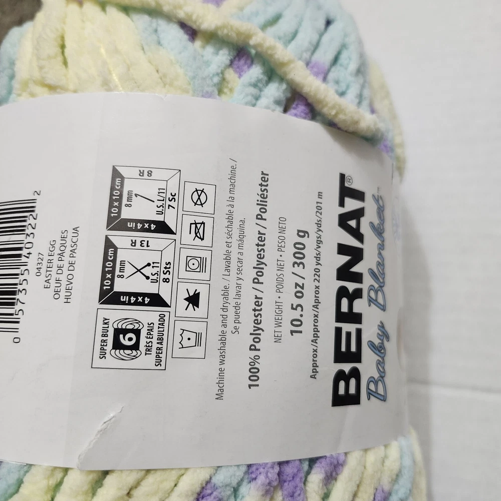 Style:BabyFiber Content:100% PolyesterUnit of Sale:LotShape:Skeingtin13:Does not applyColor:Multi-ColorUPC:Does not applyWeight:6 - Super BulkyType:Blanket YarnBrand:Bernat