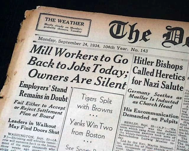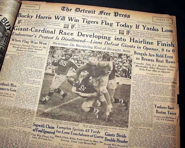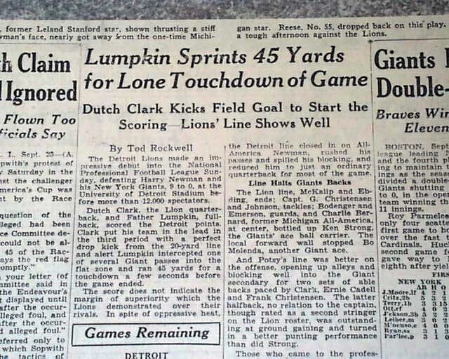 Best DETROIT LIONS Very 1st NFL Football Game Franchise History 1934 Newspaper Offered is an original, collectible newspaper (NOT a copy/reproduction): THE DETROIT FREE PRESS, Sept. 24, 1934 * Detroit Lions very 1st football game * NFL - National Football League * In a Detroit publication (very rare) The front page of the sport's section (pg. 13) has a four column heading: "Lions Defeat Giants in Opener, 9-0" with subheads and related photo. (see images) Also includes stats and lineups. First report coverage continues on page 20 with lineups. Some spine wear causes some text loss here. A related photo is at the top of page 18. Great to have this this Detroit publication. I suspect this to be an extremely rare item because their was really no reason to save it at the time. Twenty pages, some heavy margin wear and chipping, especially along the right margin but doesn't affect the Lions reporting, should be handled with care. wikipedia notes: The 1934 Detroit Lions season was the fifth in franchise history and the first in Detroit; the franchise had previously played as the Portsmouth Spartans in Portsmouth, Ohio, a city with a population of approximately 40,000. Under head coach Potsy Clark, the Lions won their first ten games (of which the first seven were shutouts) then lost three straight in an eight-day span to end the season at 10–3. They finished in second place in the NFL Western Division, three games behind the undefeated Chicago Bears. Please Note: All of our offerings are 100% authentic! We do not offer reprints or reproductions of any kind. They are guaranteed to be original! Links to Archival Storage Options & Certificates of Authenticity Are Below! Historical reports may be beautiful or ugly, but they are always informative. While we rejoice in the beautiful (heroic, discovery, amazing feats, etc.), we at History's Newsstand also offer "the ugly" for we are determined to learn from the wrongs of the past - understanding, to do so, we must be willing to look these wrongs directly in the face and shout "NO MORE!". It is for this reason many Black Americans collect historic slave ads, Jews collect reports regarding the Holocaust, women collect coverage of the Women's Suffrage Movement, etc.. If you find any to be offensive, we agree! Hopefully this is an indication we are moving in the right direction. Domestic Shipping Policy... For this specific item, A U.S. winner pays $10.00 S&H. If multiple items are purchased and paid for simultaneously , the S&H will be calculated by using the highest item's S&H as the base cost , and then adding a small amount for each additional newspaper. The per-item additional cost for newspapers, folders, portfolios, and presentation cases vary according to size and weight. All U.S. orders include in-house insurance at no additional cost to the buyer and include delivery confirmation. All orders include tracking & delivery confirmation. Orders ship within 24 business hours of receiving payment. Some small items may be shipped 1st Class. We will still provide tracking and insure them at our expense. Combined Shipping Notice If the automated eBay checkout process does not properly combine shipping, we will refund overages automatically. If you prefer, contact us prior to payment to obtain a revised invoice. International S&H Policy... If the S&H to your location is not given, international buyers/winners should contact us for an invoice which includes S&H . Import duties, taxes, VAT. etc. are not included in our quoted S&H. These charges are the buyer’s responsibility. Note: We will not falsify customs declarations or mark an item as a "gift" in order to avoid customs fees. If insurance is desired, be in touch for a quote. All insured orders are subject to customs, duties, & taxes for the amount insured and are the buyer's responsibility. International purchasers are encouraged to take advantage of our combined shipping policy to lower the cost per item S&H. If you wish to take advantage of combined shipping, please do not pay for any until you are finished - and then contact us for a combined invoice. If You Are Unhappy With Your Order We make every effort to provide the best possible buying experience. If we fall short of your expectations in any way, please contact us so we can try to make things right for you. Archival Storage... ...is available for an additional $15.00, plus an appropriate adjustment to S&H (see above Shipping Policy). If desired, purchase this directly (through eBay) at: archival storage folder . Again, to insure you will receive the appropriately sized folder for your item, please select the $15.00 folder option. Certificate of Authenticity... A certificate of authenticity is also available for an additional $3.00, which includes both the issue date and title, and certifies, by Timothy Hughes Rare & Early Newspapers, the issue to be authentic & original. If desired, purchase this directly (through eBay) at: certificate of authenticity . About Us... Contact Information... We have been both collectors and dealers in rare newspapers since 1975, serve as consultants to multiple museums, and are members of both the Ephemera Society of America and the American Antiquarian Society. Bid & Buy with confidence knowing every item we offer is guaranteed to be authentic. Timothy Hughes Rare Newspapers P.O. Box 3636 Williamsport, PA 17701-8636 Hours: M-F, 7:30-4:00 EST View our additional ebay offerings "...desiring to conduct ourselves honorably in all things." Heb. 13:18 In an effort to honor eBay's policies and our loyal customers who watch our listings, we do not end auction items early. We hope you understand! " Were it left to me to decide whether we should have a government without newspapers, or newspapers without a government, I should not hesitate a moment to prefer the latter." Thomas Jefferson