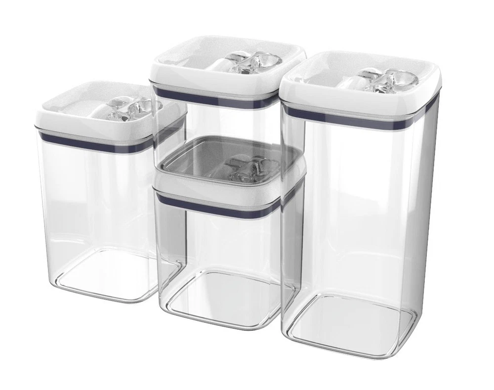 Keep your kitchen countertops organized with Better Homes & Gardens Flip-Tite® Food Storage Containers. It is a handy item to have in your kitchen or pantry. These food storage containers are great for storing dry foods, such as flour, dried beans, pasta, and more. They're made without Bisphenol-A (BPA) to ensure the safety of your food. The see-through container makes it easy to identify the contents at a glance without having to label each canister. Open them with ease and stack one or more on top of the other for space-saving storage. This 4 pack set includes 1 of 6.2-cup small square food storage container, 1 of 10.1-cup medium square food storage container, 1 of 13.8-cup large square food storage container, 1 of 19-cup square tall food storage container and 4 lids. On Dec 18, 2024 at 23:26:56 PST, seller added the following information: