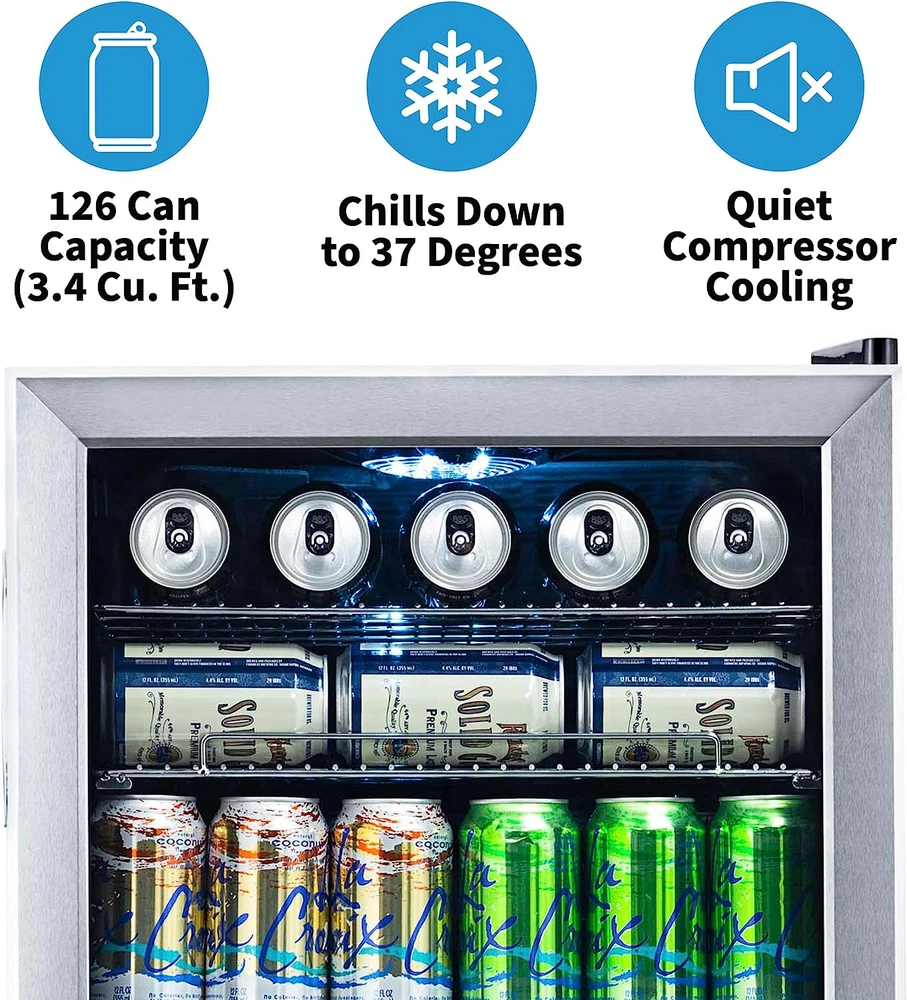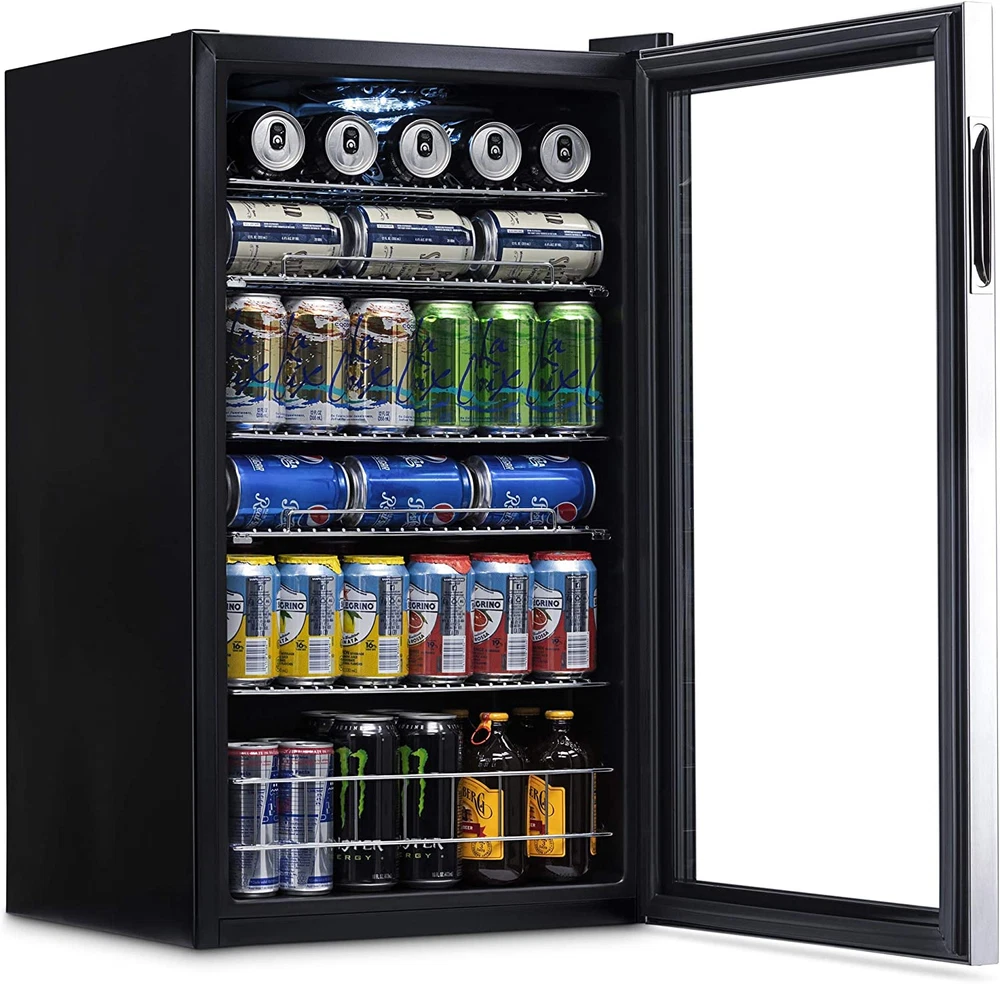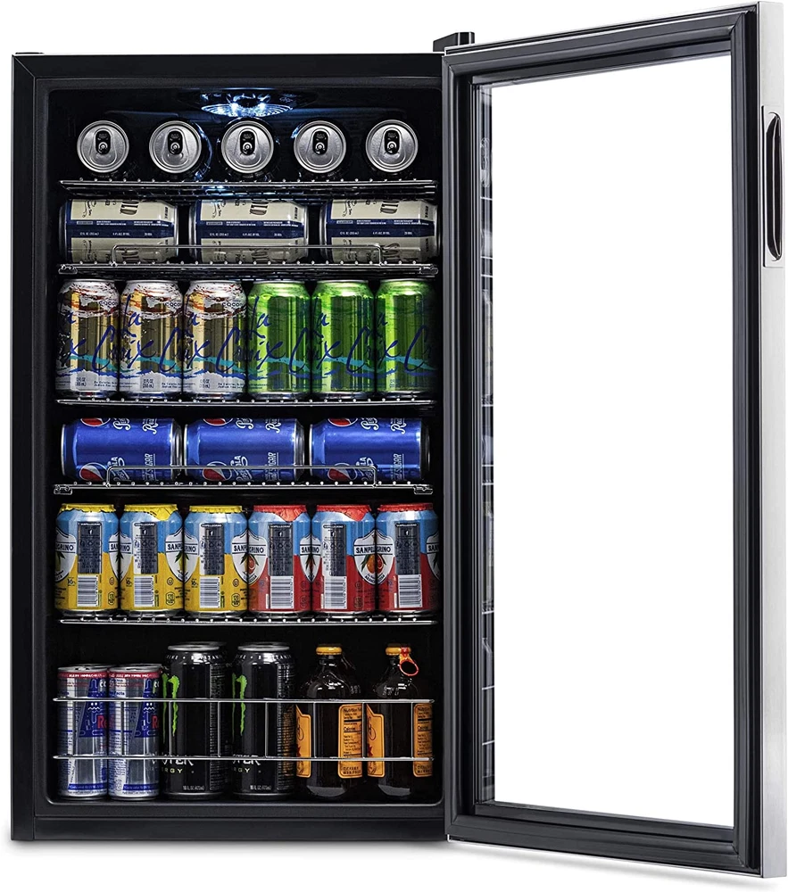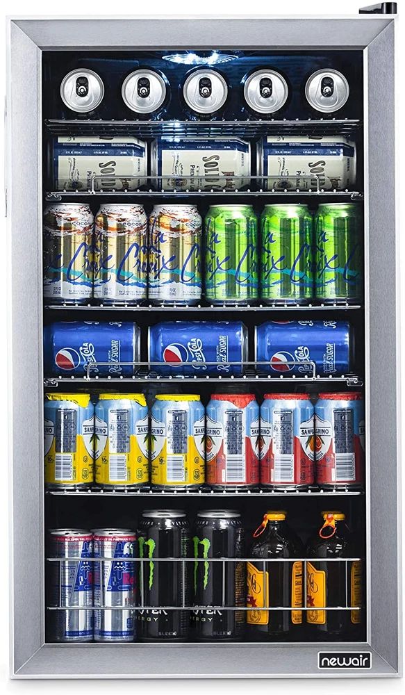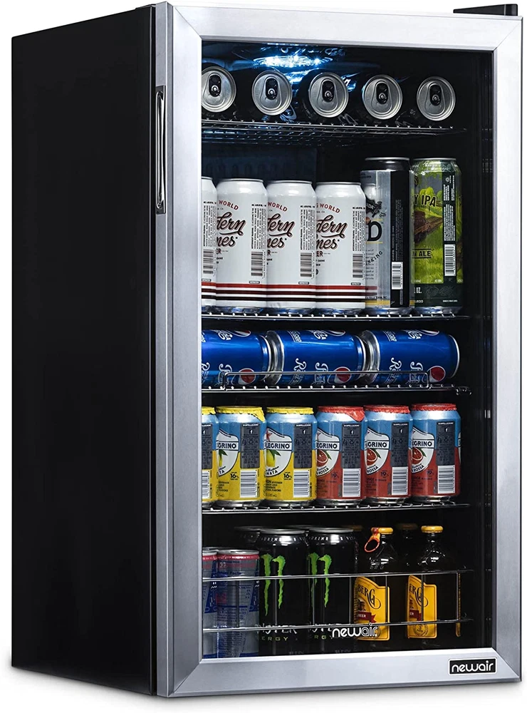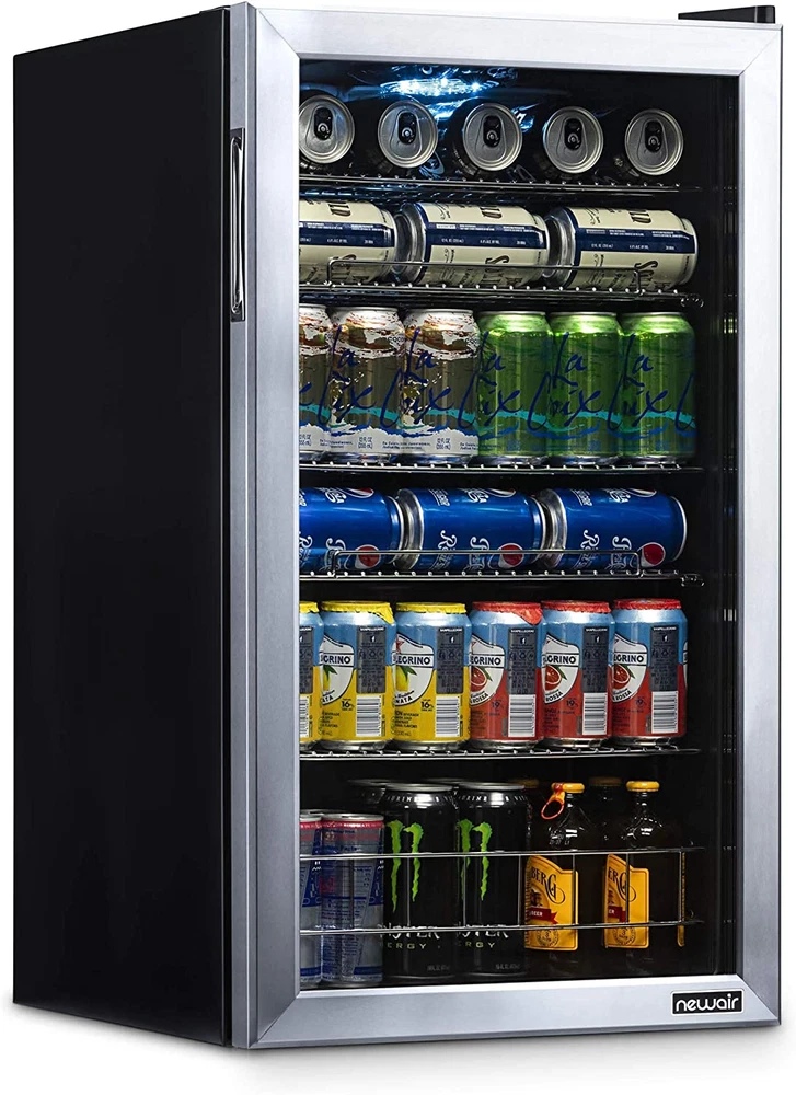 Beverage Refrigerator Cooler | 126 Cans Free Standing with Right Hinge Glass Doo [A FRIDGE YOU CAN USE ANYWHERE] - This mini fridge is perfect for storing lunch at the office, leftovers in your dorm room, or a cold drink anywhere in your home. No installation necessary, simply plug it in and you’re ready to go. [PERFECT FOR ANY PURPOSE] - Holds everything from soda, beer, wine and more so you can stay stocked for any occasion. Features a reversible glass door and timeless stainless-steel frame so you can view your contents from a glance. [VERSATILE REMOVABLE SHELVES] - Adjust the 3 removable shelves to hold nearly any combination of items. Pack it full of standard cans or make room for taller sized cans and bottles. [7 CUSTOM TEMPERATURE SETTINGS] - Choose from 7 custom “set-it-and-forget-it" temperature settings to keep beer and soda at the perfect temperature for serving. Store all your family favorites from 37°F-64°F. [COMPACT SIZE, SPACIOUS INTERIOR] - We designed this fridge to hold the maximum amount of contents with no wasted space. Enhance your lifestyle while taking minimal space in your home. Product Description The Newair 126 Can Beverage Fridge is our best seller for a reason: adjustable shelves let you create customized storage for different sized cans and bottles, and the roomy design stores over 20 full six-packs to keep you fully stocked. Top it off with an attractive design, and this fridge is sure to please. 1. Spacious Design Has Room for 126 Standard Cans With the capacity to hold up to 126 standard cans, you can fit all the drinks you want inside - without having to redesign your kitchen or home bar to make room for a larger appliance. That's over 20 full six-packs, so you'll never be left high and dry in the middle of a party or potluck. 2. Removable Storage Shelves for Flexibility Adjustable shelves allow you to hold nearly any combination of items. Pack it full of cans for a party, or make room for taller sized cans and bottles, or a week's worth of juice boxes for the kids. 3. Double-Paned Doors Keep It Cold A double-paned glass door provides outstanding insulation to keep all that cold air inside. The durable stainless-steel door is on-trend and comes with a reversible recessed handle so you can open it in either direction. 4. Set-and-Forget Thermostat with 7 Custom Settings The Newair 126 Can Compact Beverage Fridge features a powerful compressor cooling system that keeps your drinks at a consistently chill 37 degrees for optimum refreshment. Choose from 7 custom thermostat settings to keep beer and soda at the perfect temperature for serving. 5. The Go-Anywhere Beverage Fridge Not too big, not too small: The Newair 126 Can Compact Beverage Fridge is the perfect size for your home, office, workshop, and any place you could use a cold drink. . From the Manufacturer With the NewAir AB-1200 126 can beverage cooler, you'll be able to keep a large supply of your favorite soda, beer, water or other beverages chilled and ready to drink. Whether you're preparing for a party, or just want to stock up in the rec room, the AB-1200 has plenty of room, with five removable racks and a spacious storage bin that's perfect for oversized bottles or cartons. This compressor cooling system chills down to 34 degrees Fahrenheit, with seven thermostat settings so you can select the perfect chilly temperature for your drinks. This freestanding unit is both durable and attractive, featuring a black and stainless steel finish that is sure to enhance any decor. For your home bar, man cave, office break room or dorm, the NewAir AB-1200 beverage cooler the answer to all your refreshment needs. Item model number AB-1200 Number of Doors 1 Capacity 3.4 Cubic Feet Door Hinges Right Material Type Stainless Steel Annual Energy Consumption 250 Kilowatt Hours Per Year Batteries Included? No Batteries Required? No Noise 35 dB Brand Name NewAir Brand NewAir Installation Type Freestanding Pattern Name Solid Configuration Freezerless Form Factor Stand Alone Defrost System Automatic Included Components Beverage Cooler Shelves 5 Country of Origin China Style Stainless Steel Item Weight 62.8 Pounds Door Material Type Glass Defrost Automatic Special Features LED Light Special Feature LED Light Part Number AB-1200 Number Of Doors 1 Shelf Type Wire Color Stainless Steel Is Discontinued By Manufacturer No Wattage 85 watts Model Info AB-1200 Voltage 110 Volts Product Dimensions 18.4"D x 18.9"W x 32.4"H Refrigerator Fresh Food Capacity 3.4 Cubic Feet ABOUT US We offer the best prices around on high quality products. Our Ebay store includes media such as books, movies, music and games while offering electronics, toys, sporting apparel, clothing, tools, general home, garden items and more. SHIPPING We are always working hard to ensure your package arrives as soon as possible. Please understand that some factors like weather, high postal traffic, and the performance of shipping companies are outside of our control. We offer free shipping to the lower 48 states and ship within 2 business days of payment, usually sooner. We do not accept P.O. Boxes. Please provide a physical address. RETURNS We offer a 30-Day Return Policy on items which you are not completely satisfied with. You have the option for a full refund or an exchange of the item. No returns are available on items shipped outside of the USA. CUSTOMER SATISFACTION We try our very best to make sure every customer is completely satisfied. If there's a problem, message us! We're happy to help.