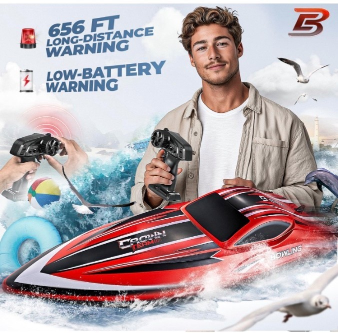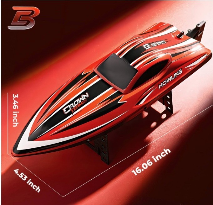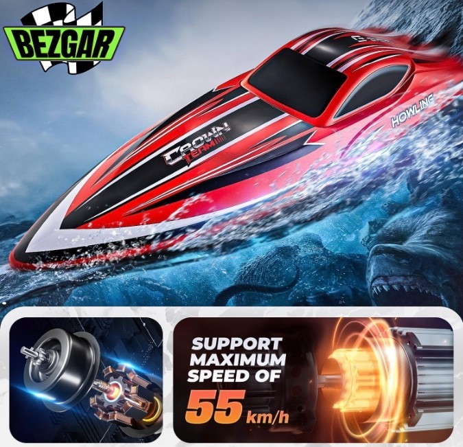 Experience the thrill of big fast rc boats with a 16 inch remote control boat for lake that's for adults and kids. This brushless rc boat offers a speed of 55+ KPH, ensuring endless fun for boys and adults Enjoy 656 ft long distance warning feature on this remote control boats for lakes. The low battery warning ensures you never lose control, making it perfect for lake adventures for 15 minutes playing time Dive into excitement with upgraded waterproof cabin and water cooling system. This large rc speed boat is built to withstand water splashes and keep the powerful brushless motor cool for boat rc enthusiasts of all ages Illuminate your path with the fantastic LED lights and one click flip feature. This remote control boat for kids and adults is designed for easy maneuverability and added visual appeal, making it a standout on any body of water Take control with the 2.4 GHZ radio system and 8 shape mode. Whether you're an adult looking for a lanchas de control remoto para adultos or a kid wanting a toy boats, this rc boat fast has the speed and control you crave Product Description Click to play video Product information Item details Brand Name BEZGAR Age Range Description 14+ years old Model Name RC Boat Batteries are Included Yes Included Components Battery, Remote, Charging Cable Number of Items 1 Manufacturer Maximum Age (MONTHS) 720 Manufacturer Minimum Age (MONTHS) 168.0 Model Number HJ818PRO ASIN B0DD37CHRY Item Height 3.46 inches Manufacturer BEZGAR Additional details Material Type Plastic, Metal Features & Specs Power Source Battery Powered Additional Features Remote Controlled, Flashing Light Operation Mode Remote Control Battery Description Lithium-Ion Maximum Speed 55 Kilometers per Hour Are Batteries Required Yes Number of Batteries 1 Lithium Ion batteries required. (included) Style Toy Vehicle Form Boat Color Red Theme Pool Toys, RC Boat, Water Toys, Remote Control Boat Subject Character rc boat Measurements Item Weight 2.2 Pounds Size 16.06 inches Item Dimensions 16.06 x 4.53 x 3.46 inches Unit Count 1.0 Count