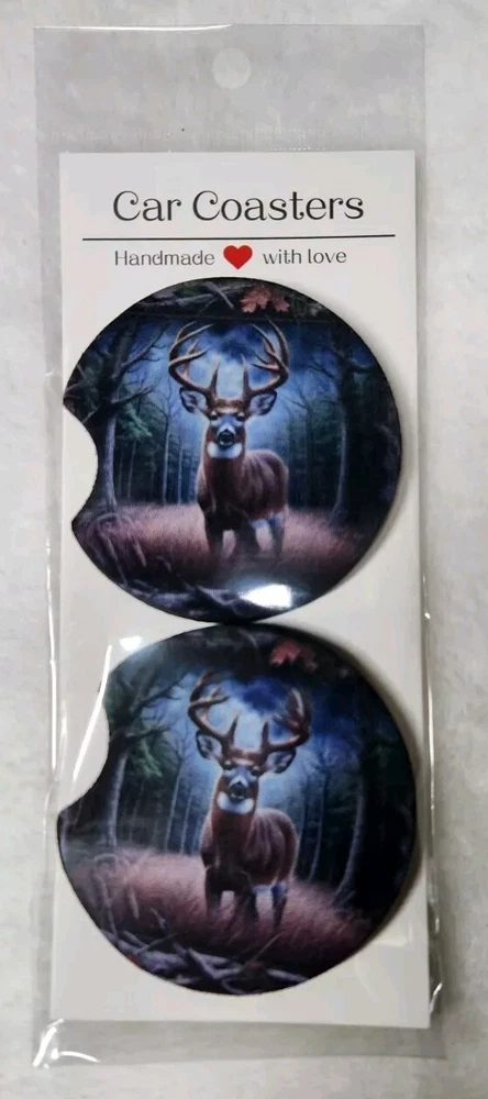 BIG BUCK IN THE WOODS . Set of 2 neoprene rubber backed non slip car coasters. 2.75" round Has a finger notch for easy placement and removal from your vehicles drink console. Handmade item ready to ship. Hand wash