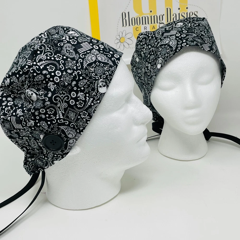 Black and White - USA Flag Skull Unisex Skull/Chemo Surgical Scrub Hat/Cap These caps are made by me in my home. If you want variety or changes, let me know. This cap is designed for doctors, nurses, attendants, and/or home healthcare providers. It is appropriate for use in hospitals, veterinary clinics, medical offices, nursing homes, etc. For Bikers/Welders - anybody needing to protect their hair. Caps can be worn by men or women with short hair. Scrub caps are one size fits most* with a tie back. Elastic bands allow for a more snug and flexible fit. These hats are made of the highest quality, 100% cotton material. Fabric is pre-washed to avoid shrinkage. Choice with or without buttons: button size and color will vary due to availabilit y. Please note: Pattern placement varies . These comfortable scrub caps will not only brighten the day of the person wearing it, but also the patients. ***This size fits most but if you have a special request, message me. We do not accept returns. If there is an issue with your product, please contact us so we can send a replacement. www.facebook.com/BloomingDaisiesCrafts www.instagram.com/BloomingDaisiesCrafts