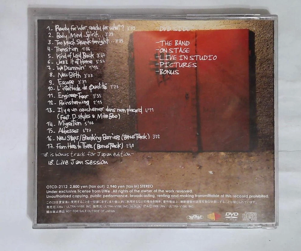 CD-1 Ready For War, Ready For Whut? 3:05 CD-2 Body, Mind, Spirit... 3:35 CD-3 Too Much Skunk Tonight... 3:35 CD-4 Transition 1:06 CD-5 Kind Of Laid Back 3:47 CD-6 Jazz It At Home 5:57 CD-7 We Drummin' 1:15 CD-8 New Birth 3:03 CD-9 Escape 3:31 CD-10 L'Interlude De Qualité 1:23 CD-11 Engineer Fear 3:35 CD-12 Rainstorming 2:13 CD-13 Il Y A Un Cauchemard Dans Mon Placard 4:11 CD-14 Migration 5:06 CD-15 Abbesses 6:27 CD-16 New Steps/Breaking Barriers (Bonus Track) 3:02 CD-17 From Here To There (Bonus Track) 2:48 DVD-1 Live Jam Session 1:30:00