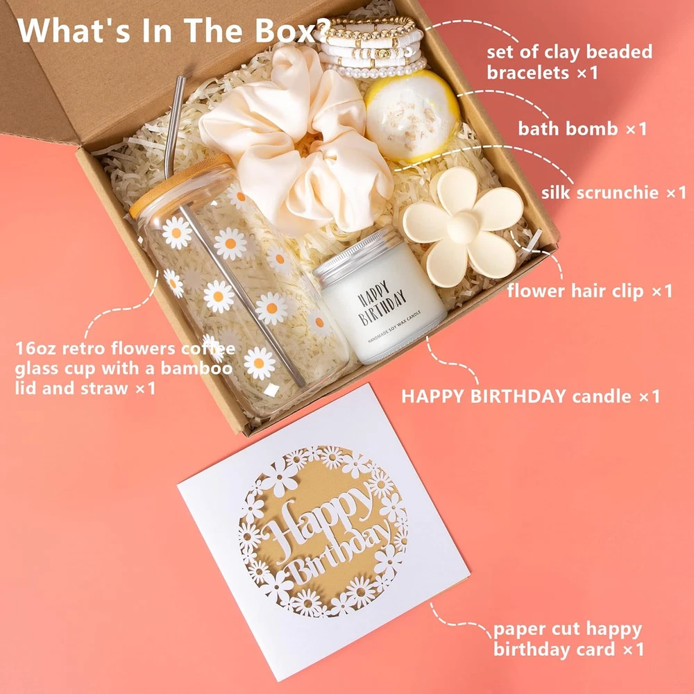Store New Arrivals Add to Favorite View Feedback Contact Fast deliveries to the customer's home Quality customer service John Make the customers happy! Birthday Gifts for Women, Teen Girl, Girl, Her, Happy Birthday Gift Box for Girl, Women, Sister, Daughter, Friends, Cute Daisy Aesthetic Glass Cups Gift Set 7Pcs, 16Oz, Beige Description What's In The Box: This thoughtfully curated gift set includes a 16oz retro flowers coffee glass cup with a bamboo lid and straw, a HAPPY BIRTHDAY candle, a bath bomb, a flower hair clip, a silk scrunchie, a set of clay beaded bracelets, a paper cut happy birthday card, and a cute box package with paper filling. Happy Birthday Gift Box: Delight your mother, friend, significant other, teen girl, daughter, wife, or girlfriend with this beautifully curated birthday gift box. Unlike ordinary dollar store gifts, our box is filled with quality-crafted items she will use every day. Send her our happy birthday gift box to bring joy and celebrate her special day! Cute Retro Daisy Flowers Coffee Glass Cup: The 16oz glass cup, decorated with charming daisy flower prints, adds a touch of nature to your morning coffee or afternoon tea. Measuring 3.1 inches wide by 6.3 inches tall, it is crafted from thick, high-quality borosilicate glass, ensuring both transparency and durability. It is free from lead and BPA and comes complete with a bamboo lid and straw. Happy Birthday Candle & Bath Bomb: Enjoy approximately 25 hours of burn time with our handmade candle, crafted using premium soy wax and fragrant oils for a soothing lavender aroma. Our eco-friendly soy wax ensures a clean, sustainable burn. The included bath bomb enhances her fragrant and relaxed bath time. Surprise Gift Box: All items are beautifully packaged in a high-quality gift basket box, ready for gifting with no need for repackaging. Our professional after-sales team is available to assist with any issues within 24 hours. If you encounter any problems, please email us. We are dedicated to ensuring customer satisfaction. What's In The Box? 1*16oz retro flowers coffee glass cup with a bamboo lid and straw 1*HAPPY BIRTHDAY candle 1*bath bomb 1*flower hair clip 1*silk scrunchie 1 set of clay beaded bracelets 1*paper cut happy birthday card 1* cute box package with paper filling Retro Daisy Flowers Coffee Glass Cup: This 16oz glass cup is decorated with charming daisy flower prints. Measuring 3.1 inches wide by 6.3 inches tall, it is crafted from thick, high-quality borosilicate glass, ensuring both transparency and durability. It is free from lead and BPA and comes complete with a bamboo lid and straw. Lavender Scented Happy Birthday Candle: This 100g/3.5oz soy wax candle offers up to 25 hours of burn time. With lovely printing, it is sure to brighten her day. The candle releases a long-lasting lavender fragrance, perfect for bath time, massage, reading, spa sessions, yoga, work, and rest. Bath Bomb: This 100g bath bomb features a cute round shape with stunning colors that will catch her eyes and please her senses. Flower Claw Clip: Our claw clips for thick hair are made with high-quality ABS material, making them durable and not easily breakable. These newly designed fashion hair clips measure 7*4cm and each weighs over 21g. They are soft and lightweight, ensuring they won't burden your hair. Silk Hair Scrunchie: With a diameter of 5.7 inches, these hair ties are easy to use and hold your hair very well. They are ideal for thin, medium, and thick hair, and can also be used as a bracelet, serving as a stylish accessory for your wrist. Clay Beaded Bracelets: The inner perimeter of these bracelets is approximately 6.8/7 inches, making them suitable for most wrist sizes. The stackable beaded bracelets are made of premium soft clay, polymer, and acrylic material, with real gold plating. They are not easy to break, waterproof, durable, and lightweight. Paper Cut Happy Birthday Card: This elite design papercut birthday card is perfect for any age. It is laser-cut from beautiful, excellent quality pearlescent card. The card measures 5.9 inches by 5.9 inches, providing a premium touch to your birthday greetings. Item model number flower coffee glass Style Retro Number of Items 7 Pattern Floral Country of Origin China Embellishment Floral Theme Birthday, Floral Material Borosilicate Glass Capacity 16 ounces Unit Count 1.0 Count Product Dimensions 3.1"W x 6.3"H Package Type Flat Free Package (FFP) Age Range (Description) Adult Specific Uses For Product Drinking beverages Included Components Straw Reusability Reusable Item Weight 2.09 pounds Material Feature Insulated Occasion Birthday Special Feature Lightweight Material Type Free Lead Free, BPA Free Color Beige Shape Round Recommended Uses For Product Home Product Care Instructions Hand Wash Only Size 16oz ABOUT US We offer the best prices around on high quality products. Our E-store includes media such as books, movies, music and games while offering electronics, toys, sporting apparel, clothing, tools, general home, garden items and more. SHIPPING We are always working hard to ensure your package arrives as soon as possible. Please understand that some factors like weather, high postal traffic, and the performance of shipping companies are outside of our control. We offer free shipping to the lower 48 states and ship within 2 business days of payment, usually sooner. We do not accept P.O. Boxes. Please provide a physical address. For shipping outside of the continental USA, we only use eBay's Global Shipping Program. The item is shipped to KY and then sent to the rest of the world. International customers are responsible for all duties and taxes. Continue to 'check out' to calculate costs for shipping the item to your country. Messages regarding eBay's Global Shipping Program MUST be directed at eBay EXCLUSIVELY. RETURNS We offer a 30-Day Return Policy on items in which you are not completely satisfied with. You have the option of a full-refund or an exchange of the i