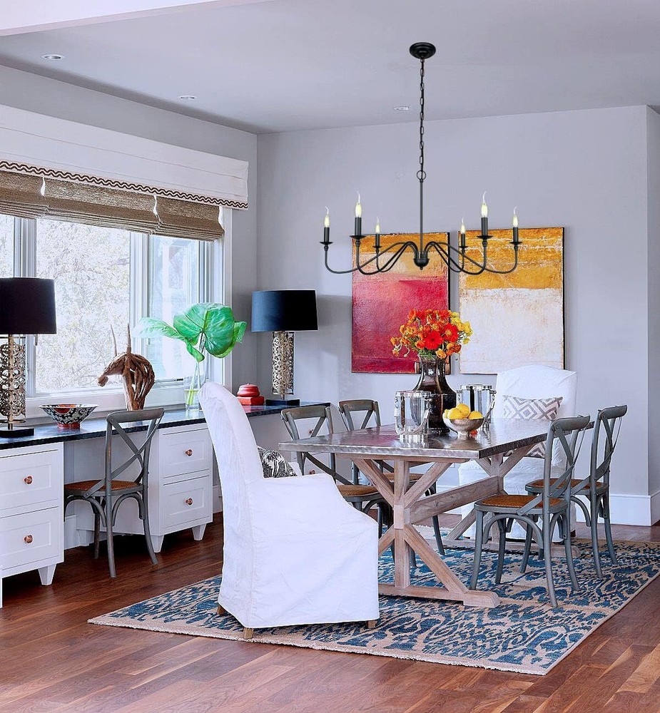 matte Black Finish 6-light can accommodate either Requires 6 E12 LED candle light (not included). This chandelier is compatible with LED bulbs. Safe packaging and easy installation.Durable/Extra Long Life/High Strength Forged Metal This chandelier is a gorgeous ceiling light. With high-quality materials and black paint finishes, the quality of vintage / country style pendant lamps is guaranteed. This country house's old industrial country chandeliers come from the Volkswagen series and are perfectly designed to illuminate your space, whether it's for a kitchen island, restaurant, step room, grower or anywhere else!