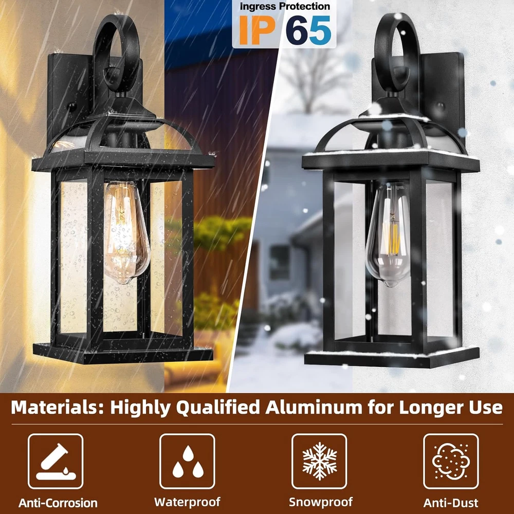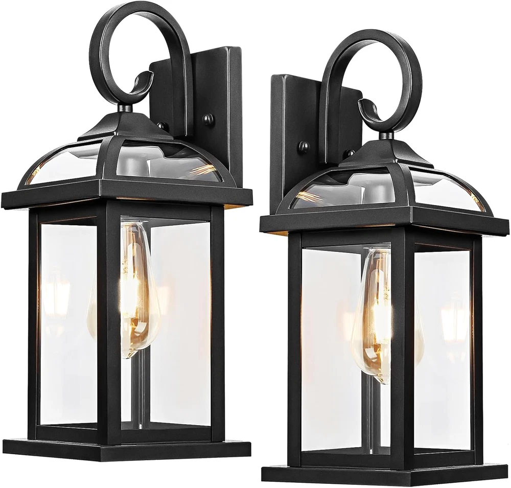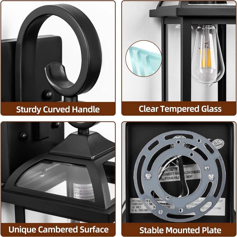 ๐๐ง๐ญ๐ข-๐๐ฎ๐ฌ๐ญ & ๐๐ญ๐ฎ๐ซ๐๐ฒ ๐๐๐ญ๐ญ๐ ๐๐ฅ๐๐๐ค ๐๐ฎ๐ญ๐๐จ๐จ๐ซ ๐๐๐ฅ๐ฅ ๐๐๐จ๐ง๐๐๐ฌ: Different from others made of iron, Roravilila choose high quality aluminum and iron in the aim to make these black exterior light fixtures for house more rugged and longer use. No worry about terrible weather conditions when you set them like front porch wall lights, patio light fixtures or lantern wall sconces. Just like your trustworthy guardian to bring you illumination and feel at your ease. ๐๐ข๐ ๐ก-๐๐ซ๐๐๐ ๐๐จ๐๐๐ซ๐ง ๐๐๐ฅ๐ฅ ๐๐จ๐ฎ๐ง๐ญ ๐๐ข๐ ๐ก๐ญ ๐ ๐ข๐ฑ๐ญ๐ฎ๐ซ๐๐ฌ: Pack of 2 black wall lanterns feature 8-side transparent tempered glass, not only for lighting but also for house decoration. Delicate craftmanship of cambered clear glass and curved handle take your home to next level. These stunning outdoor light fixtures with open bottom allow you to install or replace E26 bulbs without any effort. ๐๐ ๐๐ ๐๐๐ญ๐๐ซ๐ฉ๐ซ๐จ๐จ๐ ๐๐ฎ๐ญ๐ฌ๐ข๐๐ ๐๐๐ญ๐ข๐จ ๐๐ข๐ ๐ก๐ญ๐ฌ: Exterior light fixtures for house have Ingress Protection level 65 to make our customers relieved with their waterproof and anti-dust function. No fear with heavy rain, snowstorm or outdoor exposure. Waterproof front yard lights outdoor with clear glass deliver nice and warm lighting and drive away darkness for you and your family. ๐๐ฎ๐ญ๐๐จ๐จ๐ซ ๐๐๐ฅ๐ฅ ๐๐๐จ๐ง๐๐๐ฌ ๐ฐ๐ข๐ญ๐ก ๐๐ ๐๐ข๐ฌ๐ญ๐๐ ๐๐๐ซ๐๐ฆ๐ข๐ ๐๐๐ ๐๐ฎ๐ฅ๐ ๐๐จ๐๐ค๐๐ญ: Max Wattage 100W. These simple outdoor sconces are compatible with all E26 Bulbs, such as LED bulbs, Incandescent or CFL bulbs. Matte black hallway lanterns with ceramic bulb base ensure better corrosion resistance, while its insulating layer for better protection. Bulbs Not Included. ๐๐๐๐จ๐ซ๐ญ๐ฅ๐๐ฌ๐ฌ ๐๐ง๐ฌ๐ญ๐๐ฅ๐ฅ๐๐ญ๐ข๐จ๐ง ๐๐ง๐ ๐ ๐ซ๐ข๐๐ง๐๐ฅ๐ฒ ๐๐๐ญ๐๐ซ-๐๐๐ฅ๐ ๐๐๐ซ๐ฏ๐ข๐๐: 6.4"(L)*6.6"(W)*15"(H) Well-protected & packed parcel comes with user-friendly manual and accessory kit. Directly msg Roravilila team if you have any further question or issue with our black outside wall lights, we would reply within 24h and offer satisfying solution at our best. Product Description About our brand Shine for You Creativity Inspiration Earnestness Designed Porch Lights for House -- Pack of 2 Wall mouted lights for house with matte black power coating better dress up your lovely and warm home without effort. It is not only about cool illumination with clear tempered glass, but also nice decoration with pleased mood. Delicate design such as curved handle, cambered glass top and aluminium is built to stand the test of time. Outdoor light fixtures for house Front porch wall mount lights Entryway wall lanterns Garage wall sconces Stable Curved Handle Matte black patio lights for house waterproof have fancy tough curved handles. Stable mouted plate behind makes it bear any harsh weather condition, such as heavy rain, snowstorm and high wind. Cambered Clear Glass Head Our modern black wall sconces are made of qualified anti-rust aluminum and transparent tempered glass. When you are coming home, you could easily catch the beauty lighting with these simple wall lanterns. Open Bottom Design Outdoor garage lighting fixtures with open bottom allow you easily install or replace bulbs. Universal E26 ceramic socket is compatible with all E26 bulbs.(Bulb Not Included) Why not choose IP65 Waterproof Outdoor Sconces Anti-Corrosion?