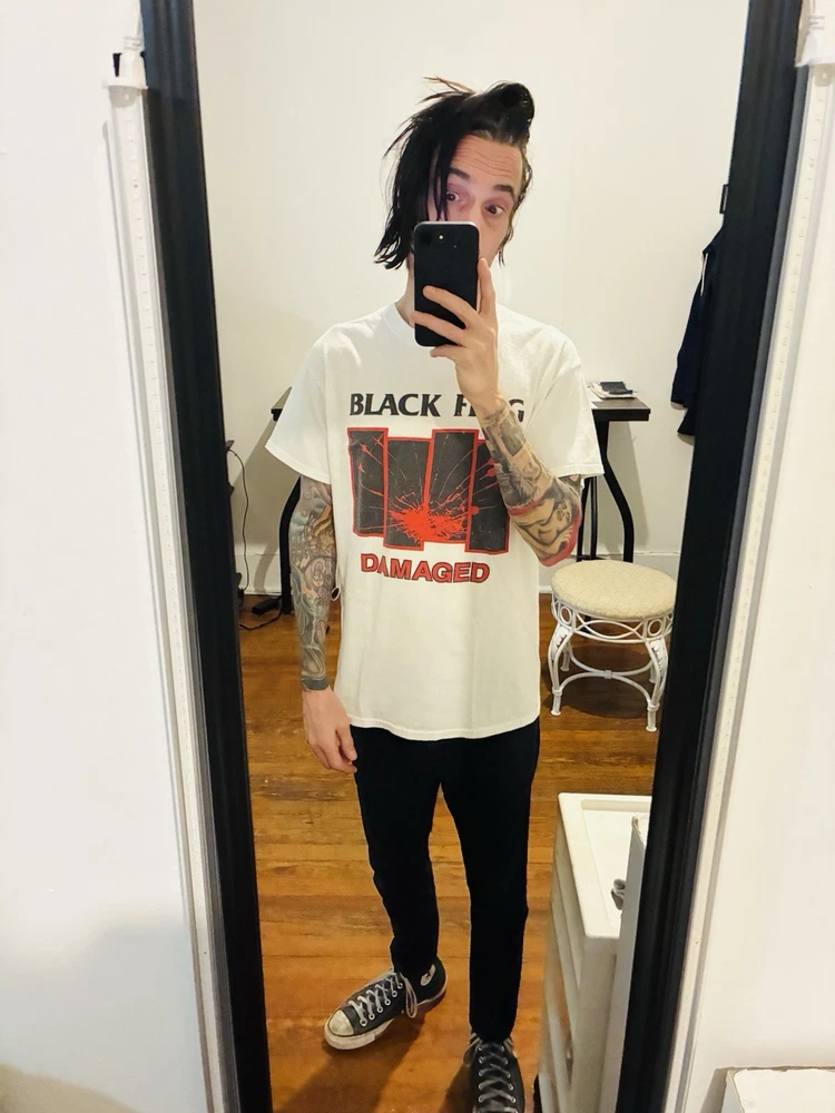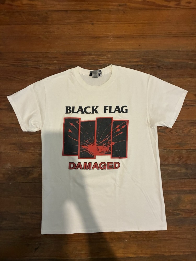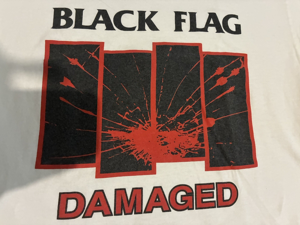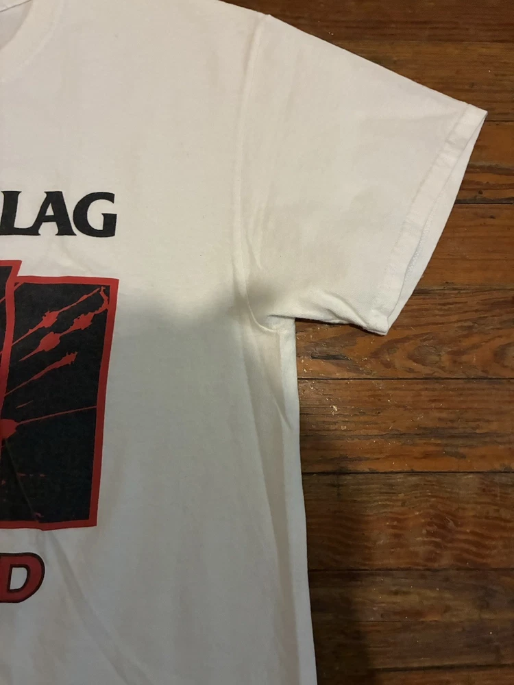 Everybody calm down; it's "legit." As you may have notitced, many sellers here on eBay have given up on listing Black Flag merch, since we all know that the legal team (probably just one dude) at SST Records routinely trawls the platform looking for items to "report." Dude (and you know it's a dude) complains to eBay that such items are in violation of copyright law. Dude has a wide berth: any item can get "flagged" for any reason, and eBay summarily caves and cancels the item, forbidding us from listing it ever again (supposedly). If this happens more than twice, they put us in "seller jail," whereby we're forbidden to list at all for three full days. But that's not the annoying part. The annoying part is that we have no recourse. Somewhere in the "canned" email we receive from eBay regarding these events, we're told that we can appeal to SST for a hearing of some sort, but that's totally useless, since no one at SST would ever respond to such an inquiry. Why would they? Anyway, I've decided to list a series of these shirts at my own peril. Each item will bear the "SST" logo and stamp, insuring--supposedly--that it's an actual piece of merch from their product line; but if I'm listing it here, it won't be some boxy new piece of crap that looks and feels like "superstore" merch. So this is a real dope one: the coveted promo tee for the great Everything Went Black compilation (mid to late 90s, judging by the old school tag), as as you can see, a great fit, bod-flattering and slim with stubby sleeves for an extra punked-out look. And again, should anyone from SST or eBay wish to question the "authenticity" of this or any other item for sale at slim_punk_vintage, hit me up: I'd love to hear about it. Have a good one.