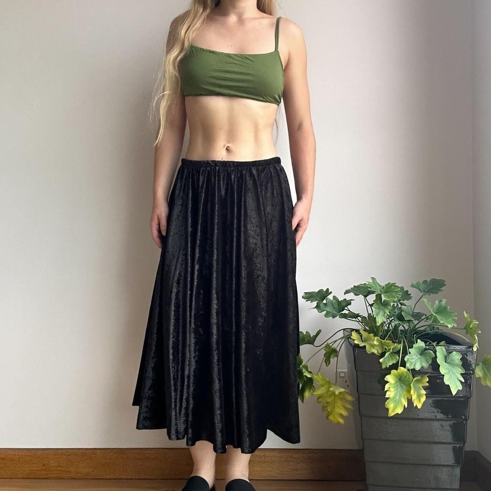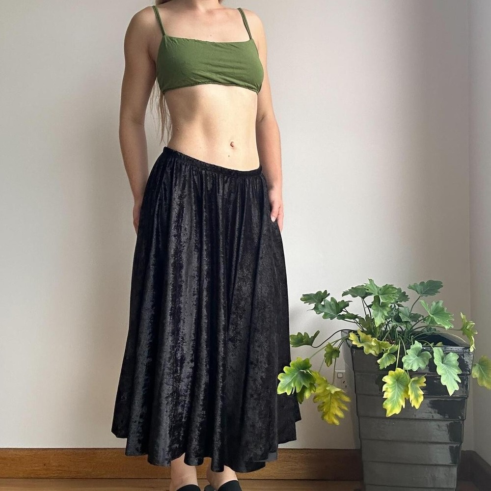 black glittery velvet midi skirt with elastic waistband no brand or size but would best fit approx size medium flatlay measurement (cm) waist: 34-55 length: 76 instant buys are welcome international shipping available eco friendly packaging item modelled on a size 8 who is 159cm tall unpinned 19 .