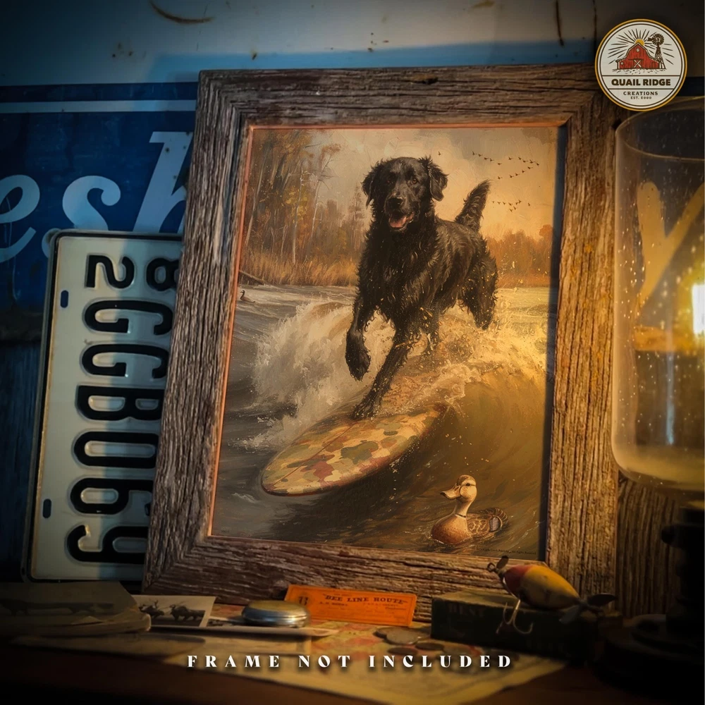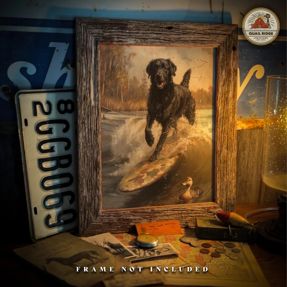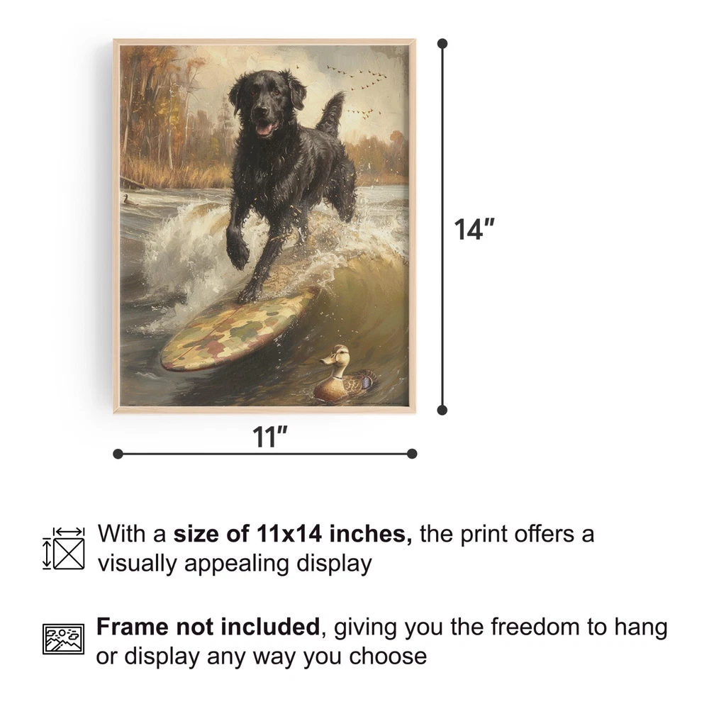 This vintage art print depicts a black Labrador dog surfing a wave. The artist, Apple Creek Publishing, created this small portrait-oriented print on paper with a handcrafted touch. The print is a licensed reprint of an artwork dating back to 2023 and does not come with a certificate of authenticity or framing. The print's style and theme are perfect for art collectors and enthusiasts who love vintage hunting art. The print's dimensions are 14 inches in height and 11 inches in width, listing it under the categories of art prints and art. This single piece print is perfect for those who want to personalize their own frame and display it in their homes or offices.
