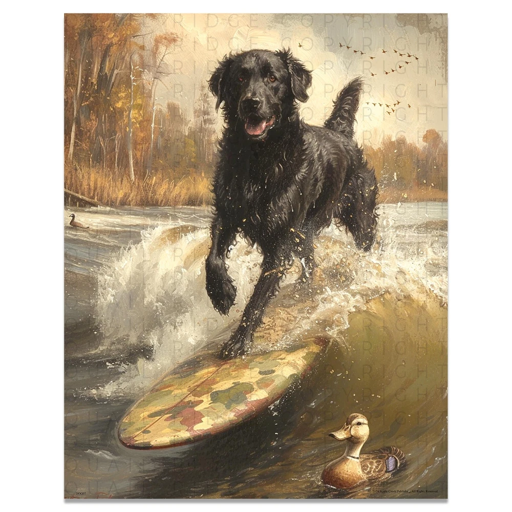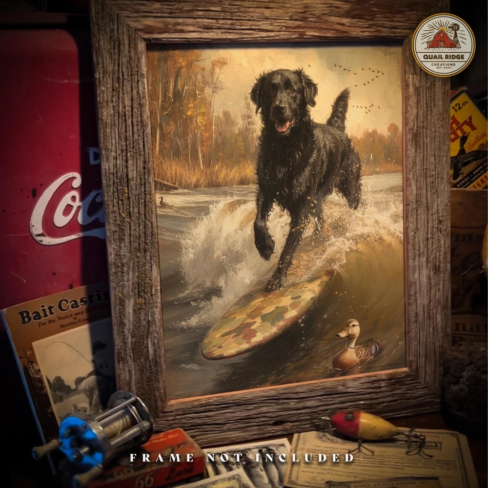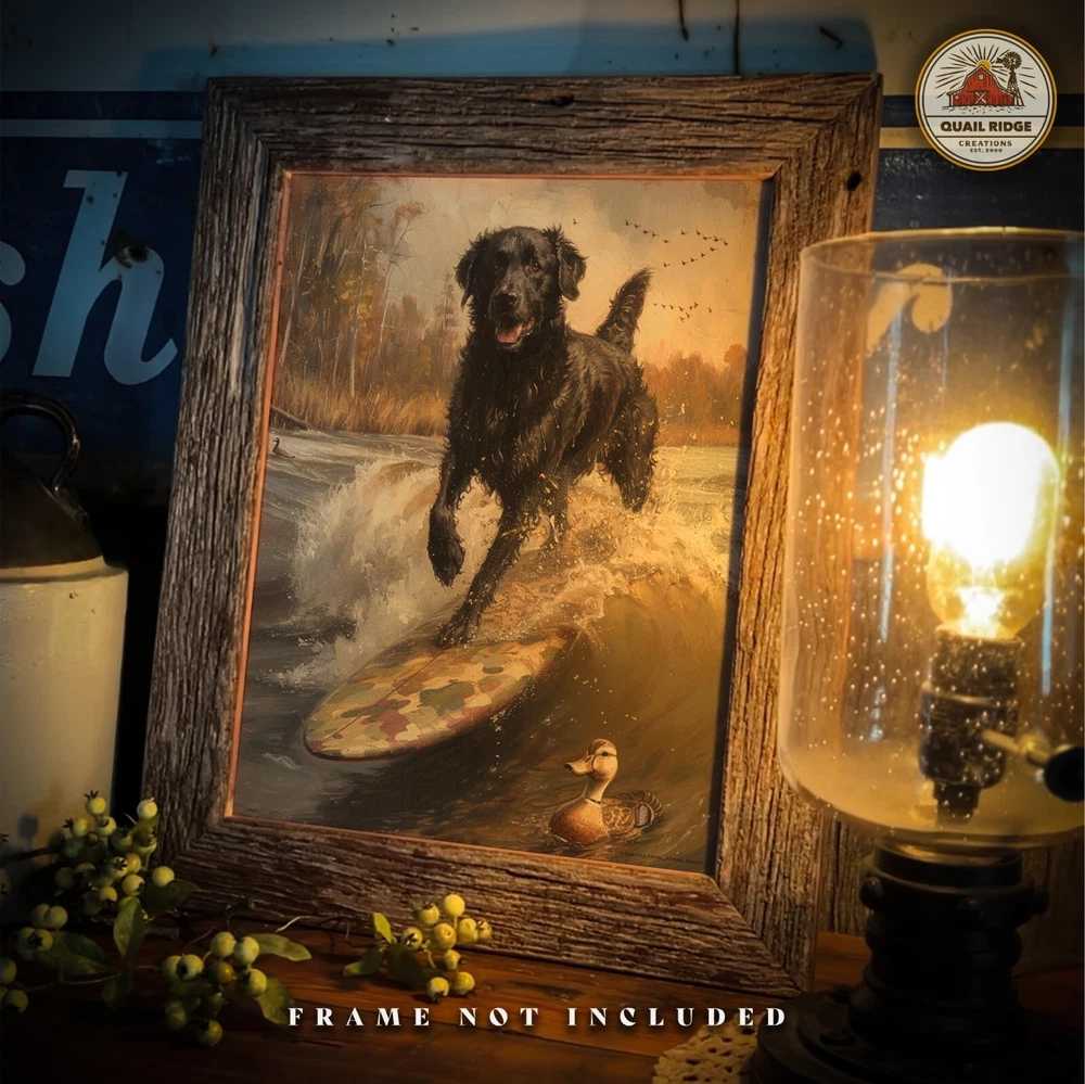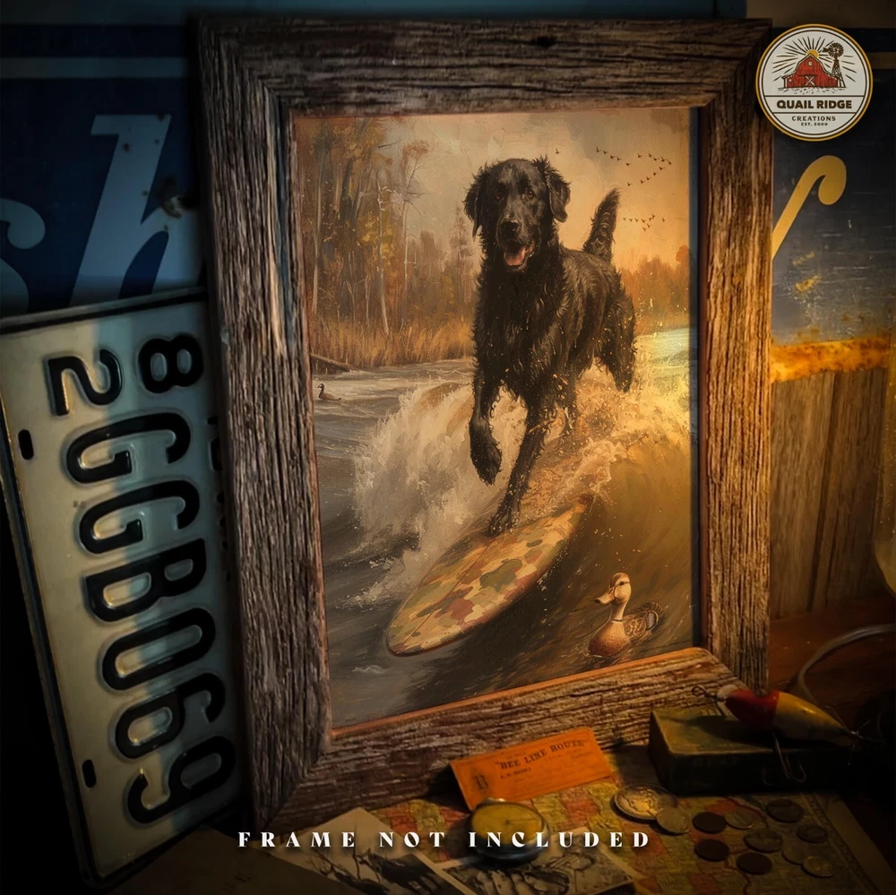This vintage art print depicts a black Labrador dog surfing a wave. The artist, Apple Creek Publishing, created this small portrait-oriented print on paper with a handcrafted touch. The print is a licensed reprint of an artwork dating back to 2023 and does not come with a certificate of authenticity or framing. The print's style and theme are perfect for art collectors and enthusiasts who love vintage hunting art. The print's dimensions are 14 inches in height and 11 inches in width, listing it under the categories of art prints and art. This single piece print is perfect for those who want to personalize their own frame and display it in their homes or offices.