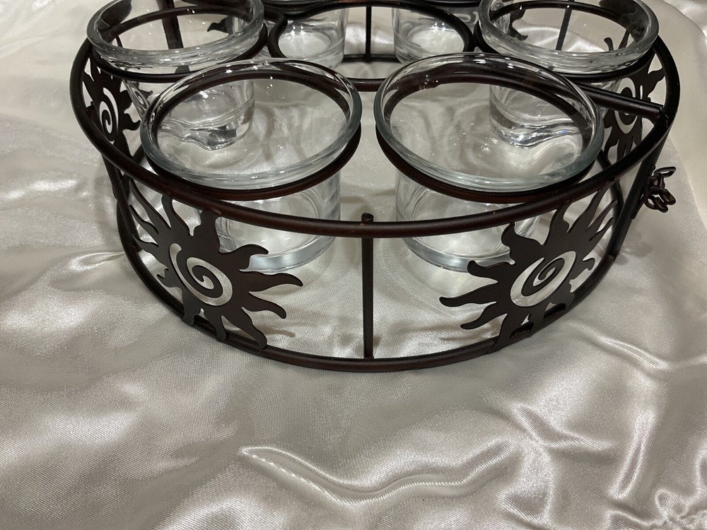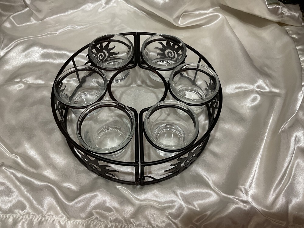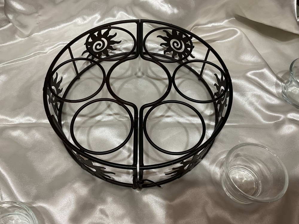 Add a touch of celestial charm to your outdoor patio with this elegant black metal candle holder. Its round design features a unique umbrella shape, adorned with six glass holders perfect for housing votive candles. The farmhouse style complements any patio table, creating a warm and inviting atmosphere for your gatherings. Crafted from durable metal and glass, this unbranded candle holder is a blend of functionality and decoration. The decorative features include a rustic finish that adds to its rustic appeal, making it an ideal choice for those who love to host dinners or late-night barbecues under the stars.