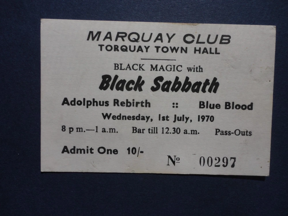 This is an original Black Sabbath concert ticket from July 1, 1970 at Town Hall in Torquay, England. The ticket features the iconic heavy metal band and is a must-have for any music memorabilia collector. Don't miss out on this opportunity to own a piece of music history.