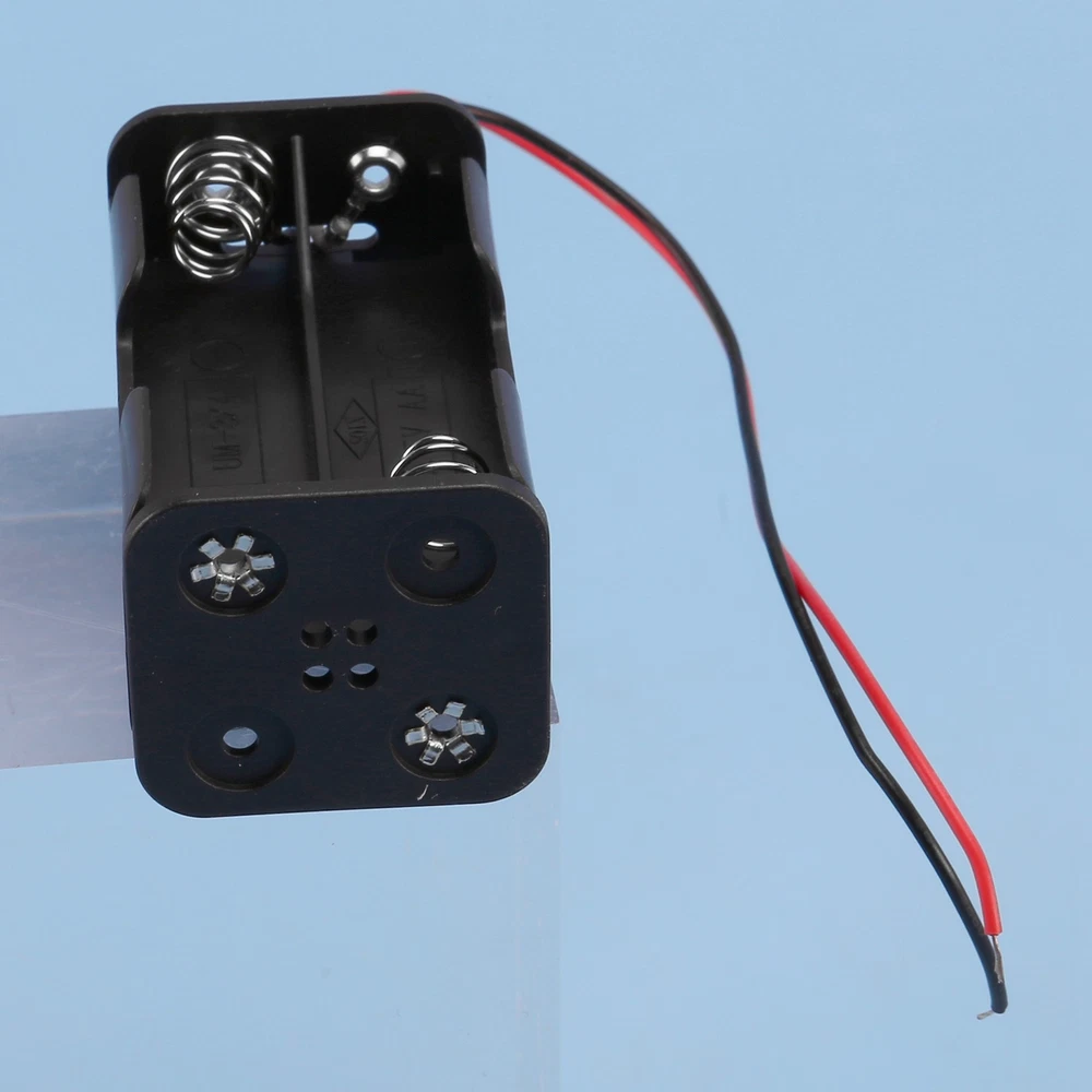 Black Tow Layers 4 x 1.5V AA Batteries Battery Holder Case Box w Wire Leads N2E9 Product Name : Battery Case;Material : Plastic, Metal Body Size : 5.7 x 3.1 x 2.9cm/2.2" x 1.2" x 1.1"(L*W*H);Cable Length( Each ) : 15cm/5.9" Battery Type : 4 x 1.5V AA;Color : Black Net Weight : 11g This battery box holder with wire connector, fit for 4 x 1.5 V AA batteries. With spring clip design, you can easily to put the battery in it. Battery is not included here. Package Content : 1 x 1.5V Battery Case Holder Note:Light and different displays may cause the color of the item in the picture a little different from the real thing. The measurement allowed error is +/- 1-3cm.