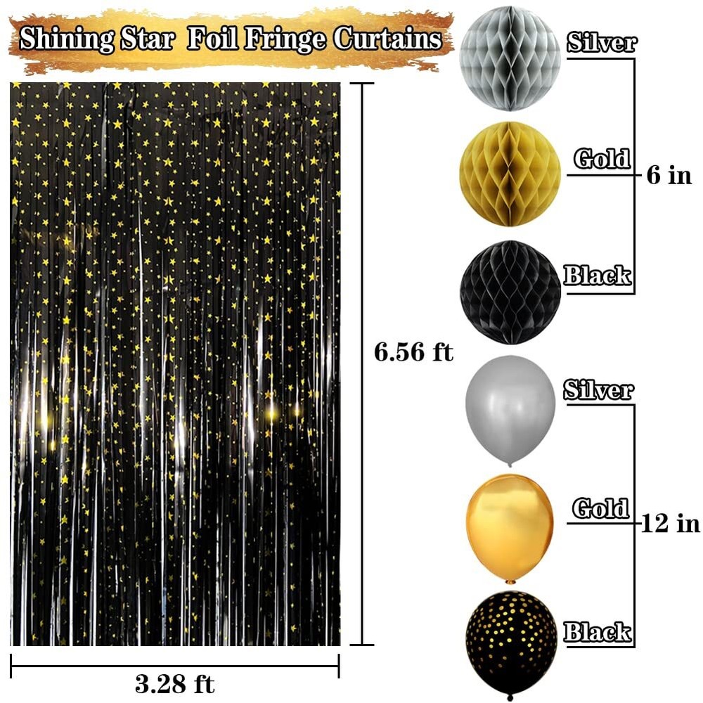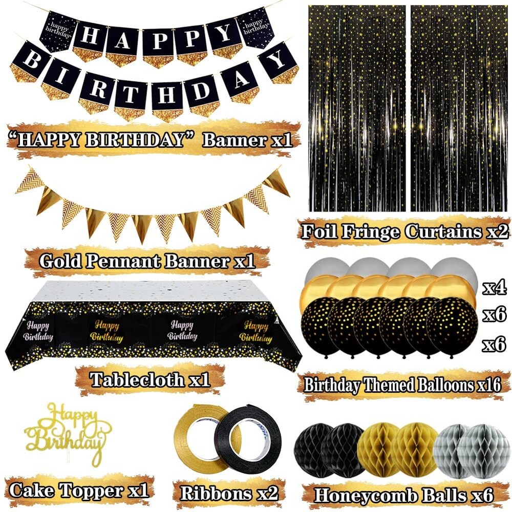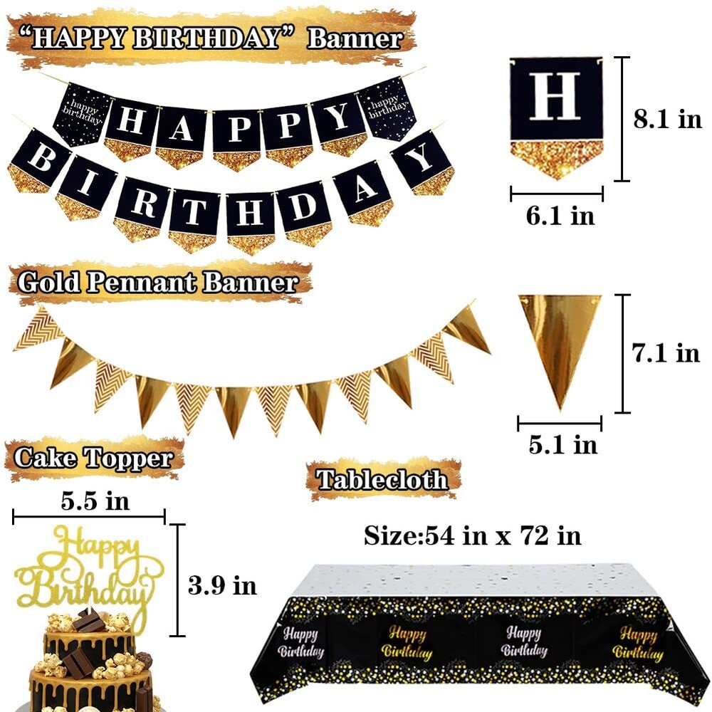 Black and Gold Birthday Party Decorations with Happy Birthday Banner, Gold Black Balloons, Birthday Tablecloth, Foil Fringe Curtains, Honeycomb Balls, Birthday Decor for Men Women Luxurious Black Gold Birthday Party Supplies- This birthday decorations kit includes 1 happy birthday banner, 1 gold pennant banner, 1 disposable party table cover, 1 cake topper, 2 shining star foil fringe curtains, 6 honeycomb flower balls, 6 gold balloons, 6 black gold dot balloons, 4 sliver balloons, 2 ribbons. The perfect black birthday decorations for a great party Easy to Assemble & Decorate- We've curated the perfect gold and black birthday party decorations for you. You can easily put them together and decorate them in any place you want for the parties in no time. Just enjoy your party with your friends Perfect birthday party decorations for any age- Our gold birthday decorations are made of high quality materials and have an elegant design. They are long lasting and can be reused for the next event. Suitable for birthday party, baby shower, happy new year party decoration and so on Make Your Party Unforgettable- The gorgeous color scheme will creates an unique backdrop for your special day! We believe the charming birthday decorations black and gold will make an unforgettable memories for you and you loved Customer Satisfaction Guarantee- Customer’s satisfaction is our priority, if you have any questions about the decoración de cumpleaños, please feel free to contact us, we will solve it for you asap Luxurious Black Gold Birthday Party Supplies- This birthday decorations kit includes 1 happy birthday banner, 1 gold pennant banner, 1 disposable party table cover, 1 cake topper, 2 shining star foil fringe curtains, 6 honeycomb flower balls, 6 gold balloons, 6 black gold dot balloons, 4 sliver balloons, 2 ribbons. The perfect black birthday decorations for a great party Easy to Assemble & Decorate- We've curated the perfect gold and black birthday party decorations for you. You can easily put them together and decorate them in any place you want for the parties in no time. Just enjoy your party with your friends Perfect birthday party decorations for any age- Our gold birthday decorations are made of high quality materials and have an elegant design. They are long lasting and can be reused for the next event. Suitable for birthday party, baby shower, happy new year party decoration and so on Make Your Party Unforgettable- The gorgeous color scheme will creates an unique backdrop for your special day! We believe the charming birthday decorations black and gold will make an unforgettable memories for you and you loved Customer Satisfaction Guarantee- Customer’s satisfaction is our priority, if you have any questions about the decoración de cumpleaños, please feel free to contact us, we will solve it for you asap Shipping from the USA All of our products are shipped from the USA, ensuring quick delivery to your destination. Payment We offer the following payment methods: PayPal, credit card, bank transfer, and eBay's secure payment system. Free Shipping & Free Returns Shipping within the USA is FREE. Additionally, any return is absolutely free for you. Risk-Free Purchase You have the option to return an item within 30 days without any justification. We cover the return shipping costs! Fast Shipping We ship immediately upon receipt of payment. Generally, the package is delivered within 2-3 days in the USA. If it takes longer, we will contact you. Quality and Costs Made in Europe, USA, China No customs fees or additional charges Total satisfaction guarantee Invoice with declared VAT available upon request in .pdf format Feedback Your feedback is very important to us. After you pay for your purchase, you will automatically receive positive feedback from us.