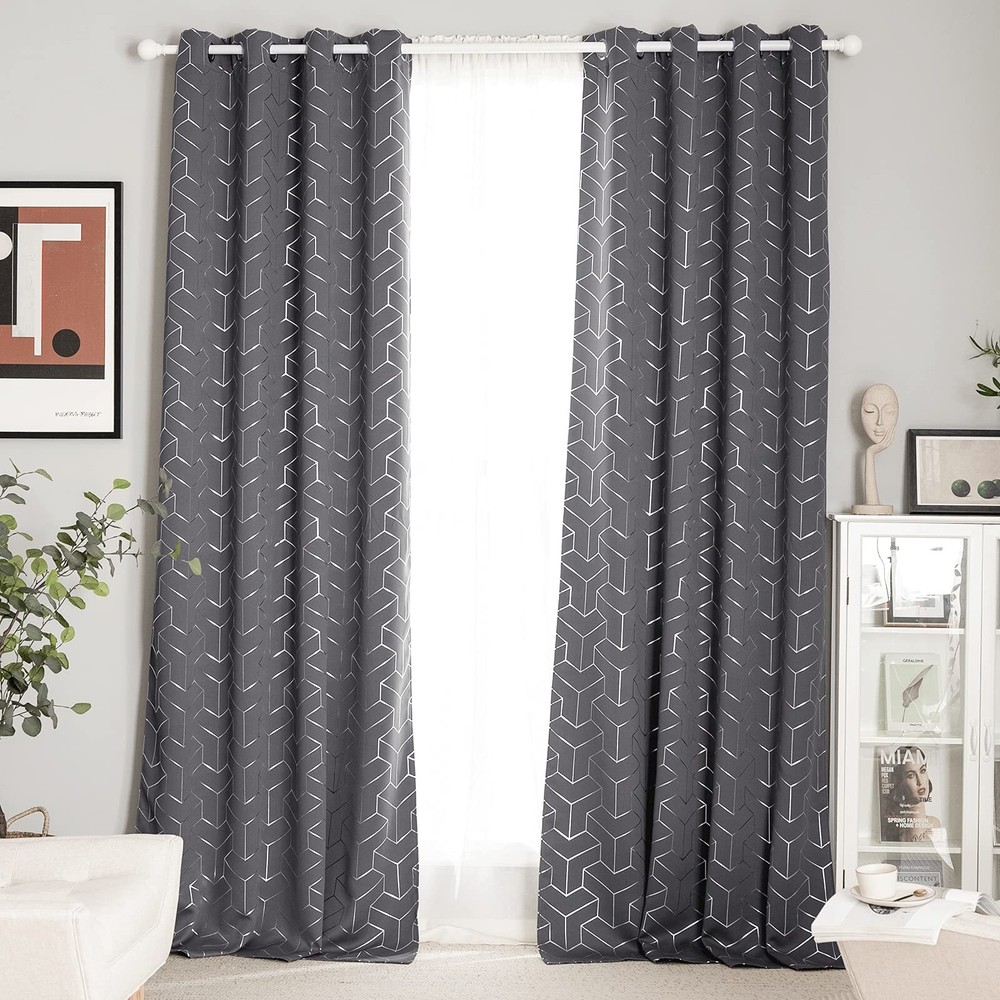 Blackout Curtains ELEGANT DESIGN: 2 panels per package. Each Blackout Curtain measures 52" wide x 95" long. The design of silver grommet (1.6 inch inner diameter) creates casual elegance for your house, which makes the curtains easy to install and slide. FOIL PRINTED: The classic silver T-shaped pattern on the background gives the curtains an exclusive elegant look. With digital print technology, beautifully printed with the vibrant design shown. WISE BUDGET: Protect your furniture and floor exposed to the sun, while still balancing the room temperature in summer and winter. Privacy protection. The greatest benefit is to bring you a good night's sleep, making you full of energy every day. WIDE COMPATIBLITY: Don't bother looking for sheer curtains to match, choosing different styles of voile curtains with white color in . Such curtain sets provide a more permanent harmonious window dressing, making your home lively. EASY CARE: Good quality finishing will withstand years of use. Hand washable and Wash the water temperature below 86℉. Mild detergent no bleaching. Low temperature ironing. Don’t use sharp things scratching curtains.