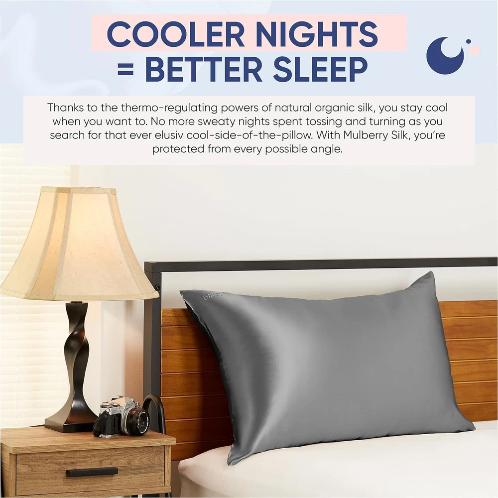 Blissy Silk Pillowcase - 100% Pure Mulberry - 22 Momme 6A Queen, Gray Description Features: 100% 22-momme 6a Grade Mulberry Silk 22-MOMME 6A GRADE MULBERRY FIBERS: Blissy Silk Pillowcases are handmade and crafted from high quality 22 Momme 100% Pure Mulberry Silk. We have spent countless hours prototyping, testing and using our products to ensure the highest quality and durability. TAKE YOUR HAIR FROM DRAB TO FAB: No more bedhead or tired hair! Kiss dryness and tangles goodbye! Blissy prevents the tugging and pulling provided by ordinary pillowcases. Plus the non-absorbent surface helps to maintain your hair’s naturally producing oils. SKIN SAVING: Why waste time and money on a pillowcase that will only absorb vital skin nutrients? With Blissy 100% Mulberry Silk, your skin will maintain the balanced moisture it needs to form a protective layer. Fight against dryness and acne, two sides of the same coin! BETTER & COOLER SLEEP: The temperature regulating properties of the Blissy silk pillowcase allow you to keep cool at all times during the night without the discomfort associated with fluctuating temperature and the constant tossing and turning for a restful night sleep. ENJOY A FRESHER MORNING: Say farewell to discomfort and hello to a more soothing sleep with our silk pillowcase. Its smooth surface is less prone to irritating sensitive skin, helping you wake up feeling refreshed, with a clearer complexion and a more comfortable start to your day. Product Details: Brand: BLISSY Pillow Type: Bed Pillow Material: Silk Size: Queen Product Dimensions: 26"L x 20"W Color: Gray Recommended Uses For Product: Indoor, Skin Protection Closure Type: Zipper Special Feature: Cooling Product Care Instructions: Machine Wash Style: Classic Theme: No Theme Pattern: Solid Number of Items: 1 Thread Count: 400 Fabric Type: 100% 22-momme 6a Grade Mulberry Silk Number of Sets: 1 Number of Pieces: 1 UPC: 850009689306 Item Weight: 4.6 ounces Manufacturer: BLISSY Item model number: Blissy Batteries required: No Handling We will ship all orders within 1 business day of payment. Delivery We Do Not Ship Outside of the Continental US. Return Policy All items qualify for returns within 30 days of receipt. Buyer is responsible for return shipping on any item that is not damaged. Feedback We take our reputation seriously, we buy and sell online, so we understand the value of trust. If you are unsatisfied with your order, please contact us and we will work with you to resolve it to your satisfaction.