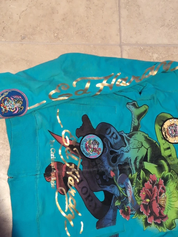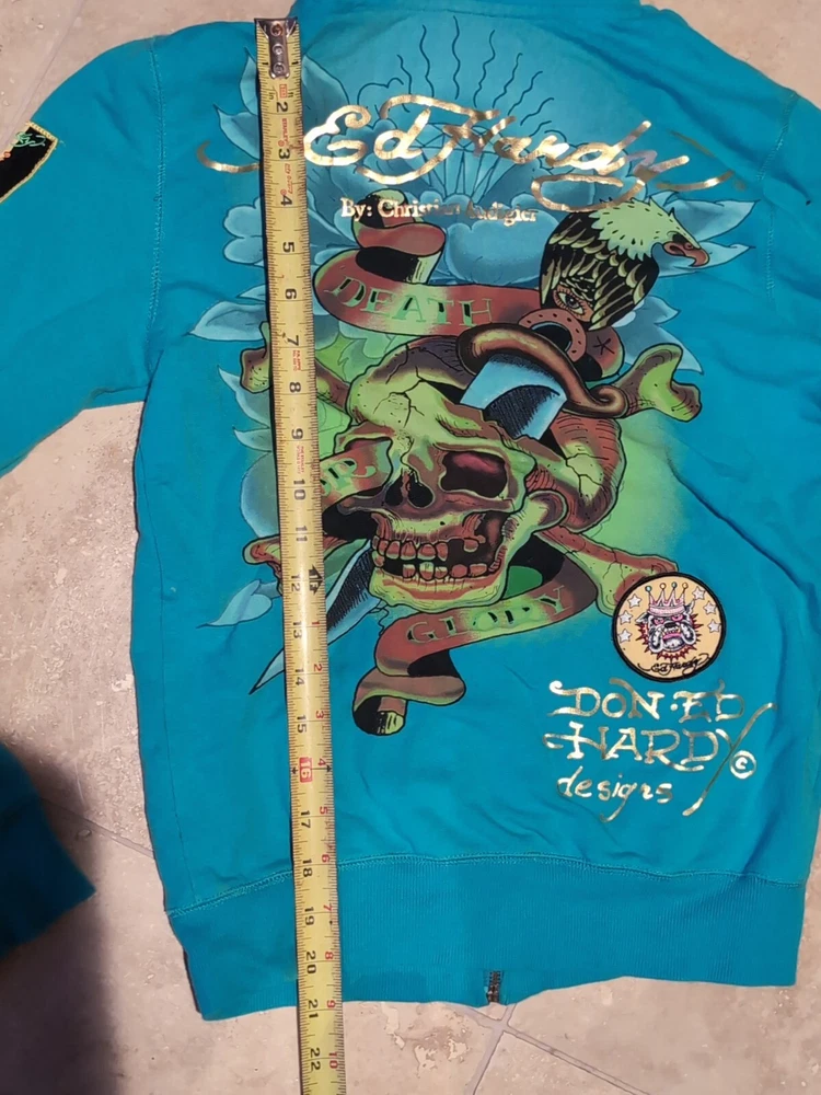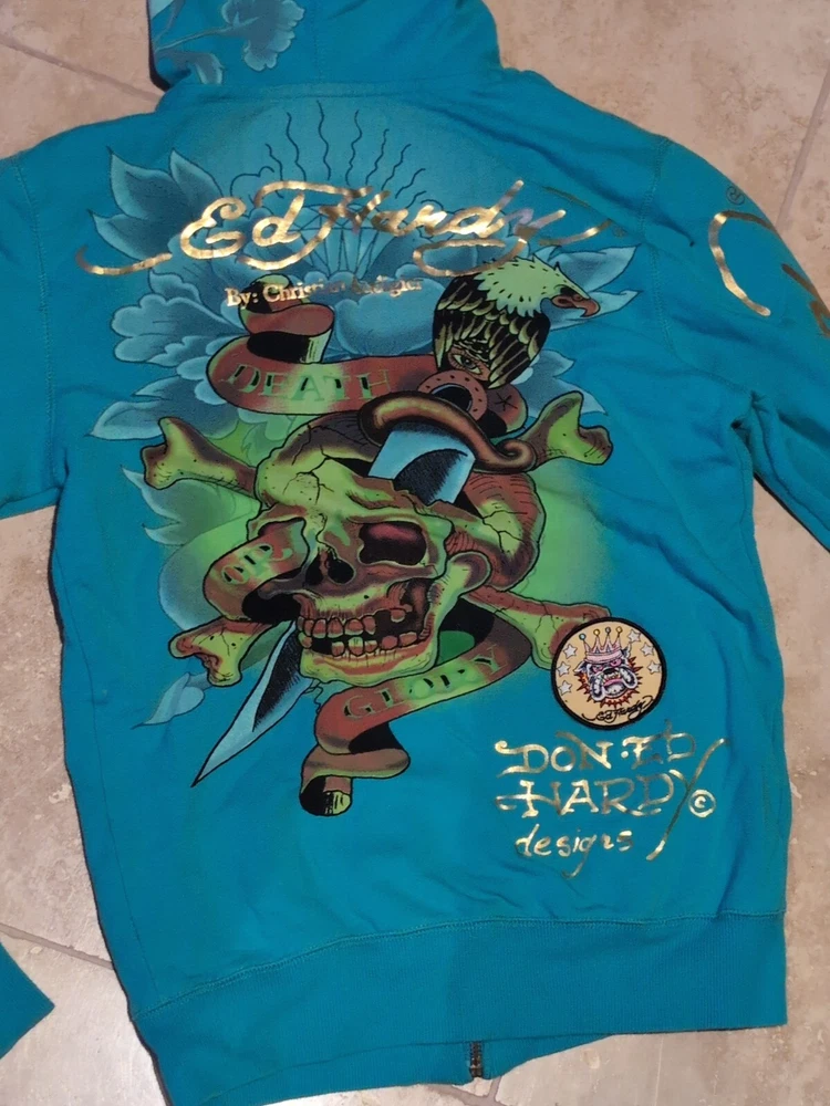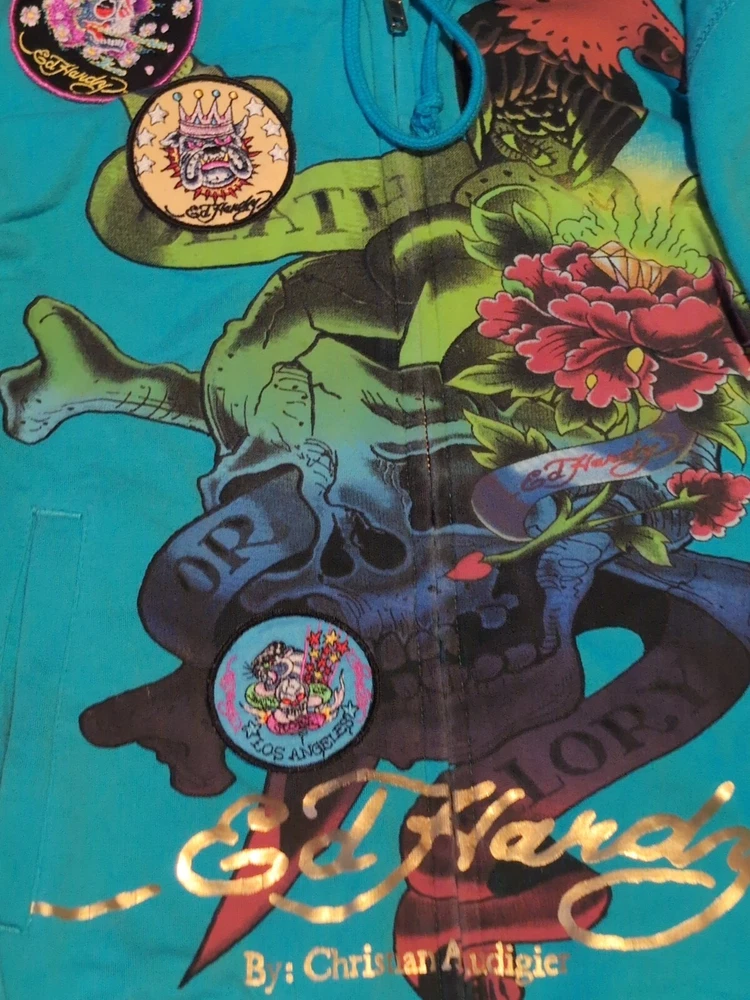 This Blue Gold Ed Hardy Hoodie, designed by Christian Audigier, is a must-have for any fashion-forward woman. The full zip style and long sleeves make it perfect for activewear, while the 100% cotton material ensures both comfort and durability. The hoodie features a skull and dagger design with the words "Death or Glory" in blue and gold, making it a statement piece that is sure to turn heads. The hoodie is available in size XS and is ideal for women who love the gold and love themes. The closure is a zipper, and the accents include the Ed Hardy logo. This hoodie is perfect for any occasion, and the blue and gold color combination is sure to make you stand out from the crowd.