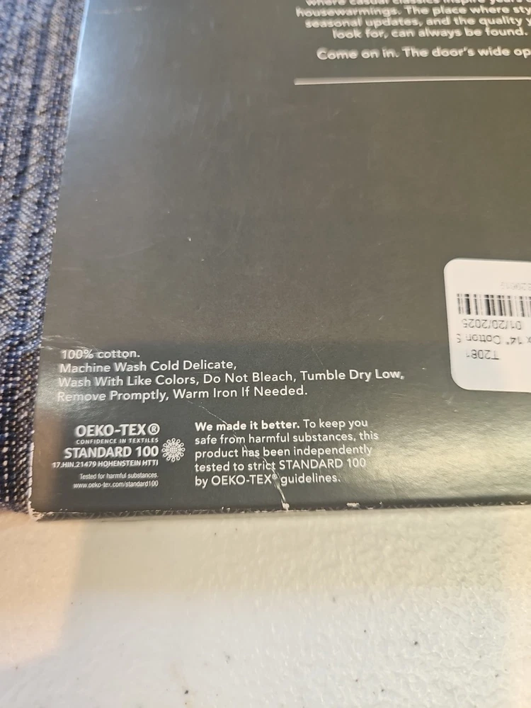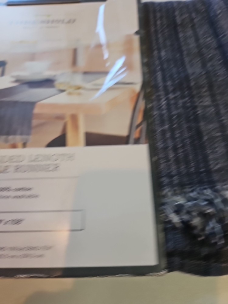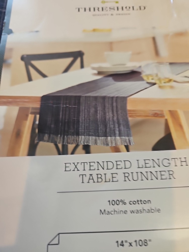 Add a touch of elegance to your dining table with this beautiful blue table runner from Threshold. Measuring 108 x 14 inches, it is perfect for any dining table and will complement any decor. Made from high-quality materials, this table runner is durable and easy to clean. Ideal for use in your home or office, this table runner is a must-have for anyone who wants to add a touch of style to their table setting. The Threshold brand is known for its quality and style, and this table runner is no exception. Whether you're hosting a dinner party or having a family meal, this table runner will make your table setting look stunning. New in wrapper Fringed From a smoke and pet free home.
