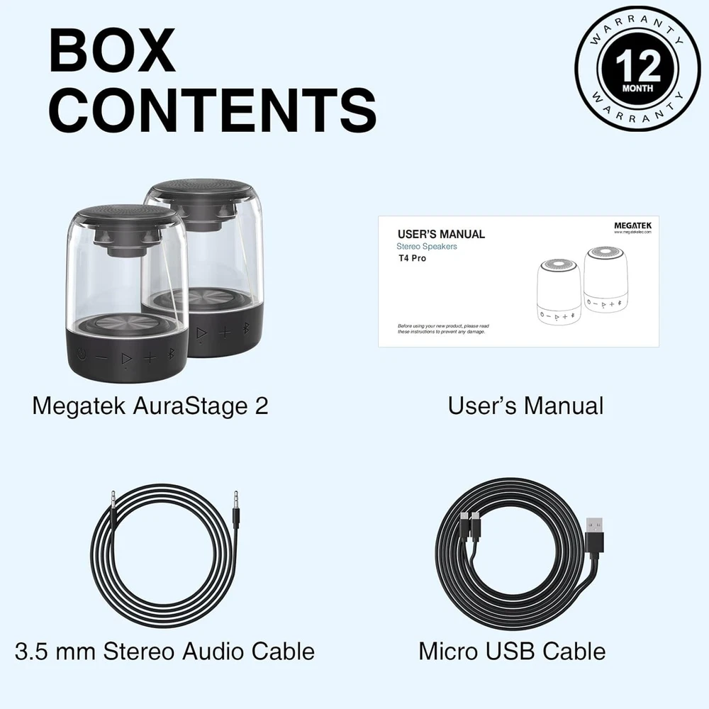 IMMERSIVE STEREO SOUND – Experience an immersive and spacious wireless stereo soundstage that makes you feel like you're right in the middle of the music, thanks to the featured TWS (True Wireless Stereo) capability. Equipped with premium speaker drivers, bass radiators and fine-tuned sound processors, this pair of speakers deliver clear, powerful, and balanced sound with deep, resonant bass. VIBRANT LED LIGHT SHOW - The LED lights will sync perfectly with the rhythm and beat of the music in 7 lighting modes, creating a mesmerizing light show that adds an extra dimension to your listening experience. EFFORTLESS CONNECTIVITY - Bluetooth 4.2 ensures wireless music streaming with stable pairing up to 66 feet (20 meters). Plus, take crystal-clear calls from your speaker with the touch of a button, thanks to the built-in speakerphone. The auxiliary (aux) input provides the option to connect your non-Bluetooth devices for wired music. UP TO 12 HOURS PLAYTIME - The built-in high-capacity rechargeable Lithium Polymer battery provides up to 12 hours of music playback at mid volume. WATERPROOF & PORTABLE - This IPX5 rated speaker is designed and built to withstand various weather conditions and has waterproof and dustproof capabilities. This handheld-sized speaker is designed to be lightweight (10 oz), making it easy to carry around in your bag, or hold in your hand. Product Description MEGATEK AuraStage Immersive Wireless Stereo and Stunning Light Show MEGATEK AuraStage With decades of expertise in sound engineering, Megatek combines cutting-edge technology, and meticulous craftsmanship to create top-notch speakers that redefine portable audio. Dual Portable Bluetooth Speakers An audio and visual experience like never before! Megatek AuraStage 2 - dual portable Bluetooth speakers are a perfect combination of unparalleled quality sound with immersive wireless stereo soundstage, thanks to its featured TWS technology, and visually stunning LED light show. Astonishing Sound Wireless Stereo Stunning Lights IPX5 Waterproof 12-Hour Playtime AUX Input Built-In Mic Immersive Wireless Stereo Sound Experience an immersive and spacious wireless stereo sound stage that makes you feel like you're right in the middle of the music, thanks to the featured TWS (True Wireless Stereo) capability. MEGATEK AuraStage Unparalleled Quality Sound Equipped with premium speaker drivers, bass radiators and fine-tuned sound processors, this pair of speakers deliver clear, powerful, and balanced sound with deep, resonant bass. Wireless Stereo Pairing (TWS) TWS capability pairs two Bluetooth speakers together and allows you to enjoy a true wirelessly stereo sound experience without the need for any wires or cables, creating a wider soundstage and a more immersive listening experience. Vibrant Led Light Show The LED lights will sync perfectly with the rhythm and beat of the music in 7 lighting modes, creating a mesmerizing light show that adds an extra dimension to your listening experience. Key Features 12-Hour Playtime The built-in high-capacity rechargeable Lithium Polymer battery provides up to 12 hours of music playback at mid volume. AUX Input The auxiliary (aux) input provides the option to connect your non-Bluetooth devices for wired music. Waterproof and Ultra-Portable This IPX5 rated speaker is designed and built to withstand various weather conditions and has waterproof and dustproof capabilities. This handheld-sized speaker is designed to be lightweight (10 oz), making it easy to carry around in your bag, or hold in your hand.