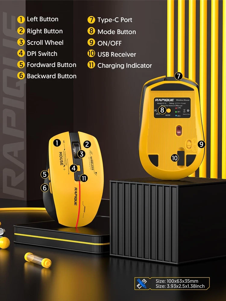 INNOVATIVE MECHA STYLE DESIGN - Experience the unique yellow and black combination that will captivate your senses, Meticulously crafted with utmost precision, this wireless is a visual delight and makes for a perfect gift choice SEAMLESS CONTROL OF 3 DEVICES - Seamlessly switch between three devices with our dual Bluetooth 5.1 modes and wireless 2.4G technology. A simple click of the mode switch button located at the bottom of the allows you to effortlessly transition from desktop to , laptop to Macbook, iPad, and more. The green, blue, and red indication lights represent BT1, BT2, and 2.4G USB respectively, ensuring easy and convenient device connectivity RECHARGEABLE & AUTO SLEEP FUNCTION - Say goodbye to battery replacements with our convenient USB to Type-C cable charging. Fast and stable charging ensures you are always powered up. Embrace energy efficiency and environmental friendliness. After 1.5 minutes of inactivity, the automatically enters sleep mode to conserve power. A simple click of any button or movement of the wakes it up instantly SILENT CLICK & HIGH RESPONSIVENESS - No more worries about disturbing others with noisy clicks. Our noiseless reduces noise by up to 90%, providing a silent working environment. With 3 adjustable DPI settings (800, 1200, and 1600), enjoy precise and sensitive cursor movement for enhanced productivity COMFORTABLE & COMPACT DESIGN - Designed for ergonomic comfort, this features an elegant profile that fits perfectly in your hand. With 6 buttons, including 2 convenient forward and backward buttons on the left side, it caters to both work and gaming needs. Tested for durability with over 5 million clicks, this ensures long-term stability WIDE COMPATIBILITY - with Windows 8/10/11, Android, and Mac OS systems via Bluetooth 5.1. For devices without Bluetooth capability, simply insert the 2.4G USB receiver for seamless connectivity. Works with desktops, laptops, PCs, Macbooks, Chromebooks, and Surface , providing versatility and convenience Note: 1. Bluetooth 5.1 supports the ios system for both iPad and iPhones, but the ios system has to be ios 14 or later version; 2. Long press the top DPI button to turn off the decorative light, and long press again to turn on it