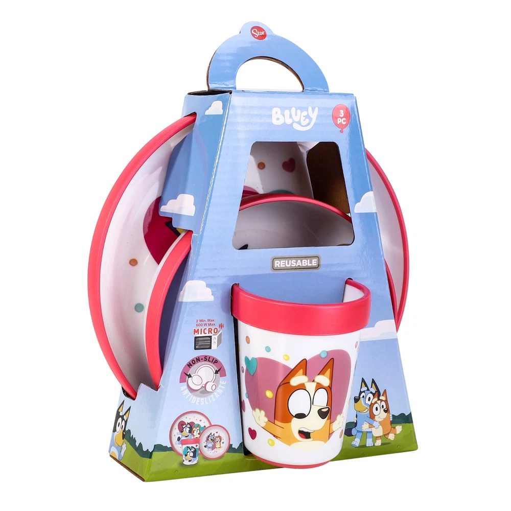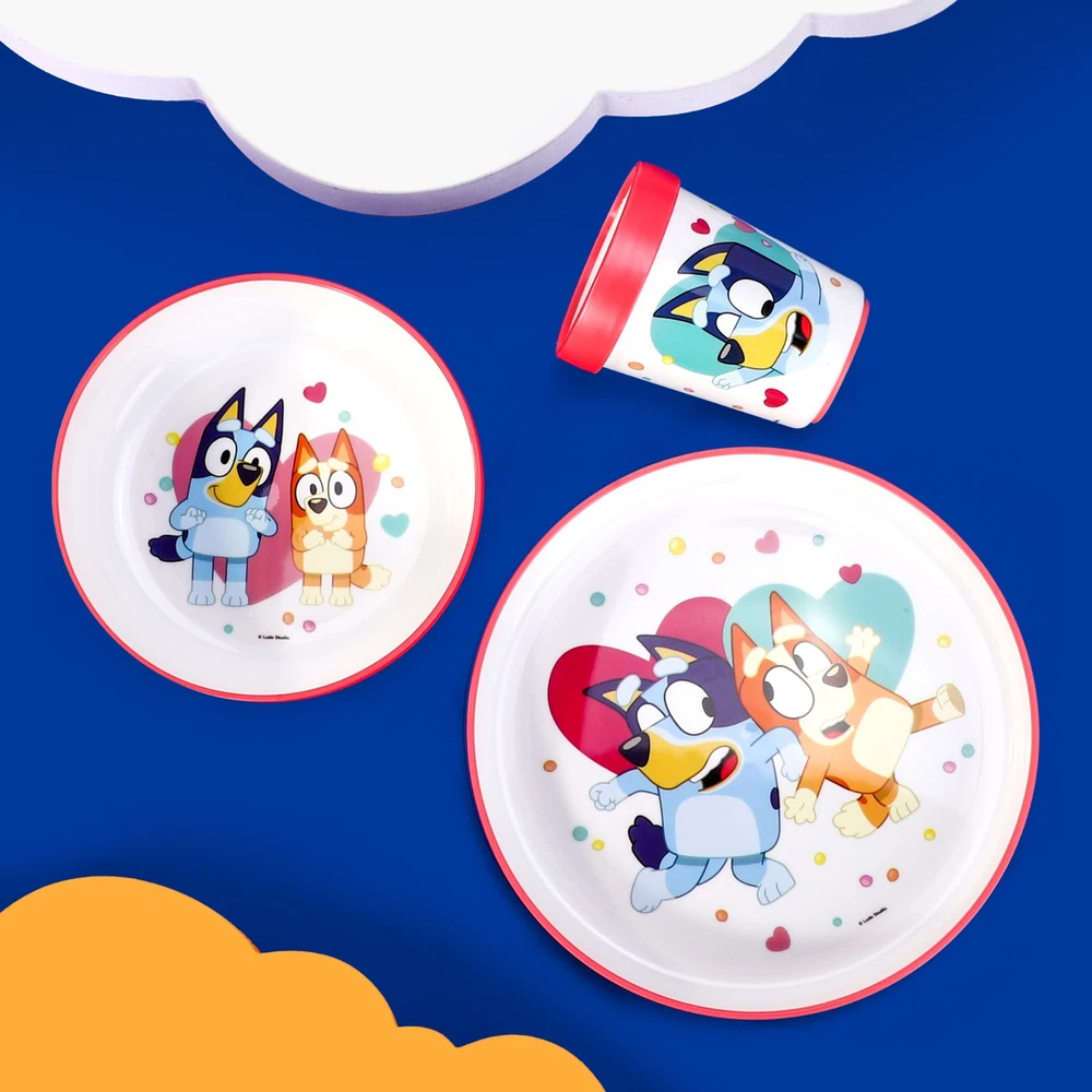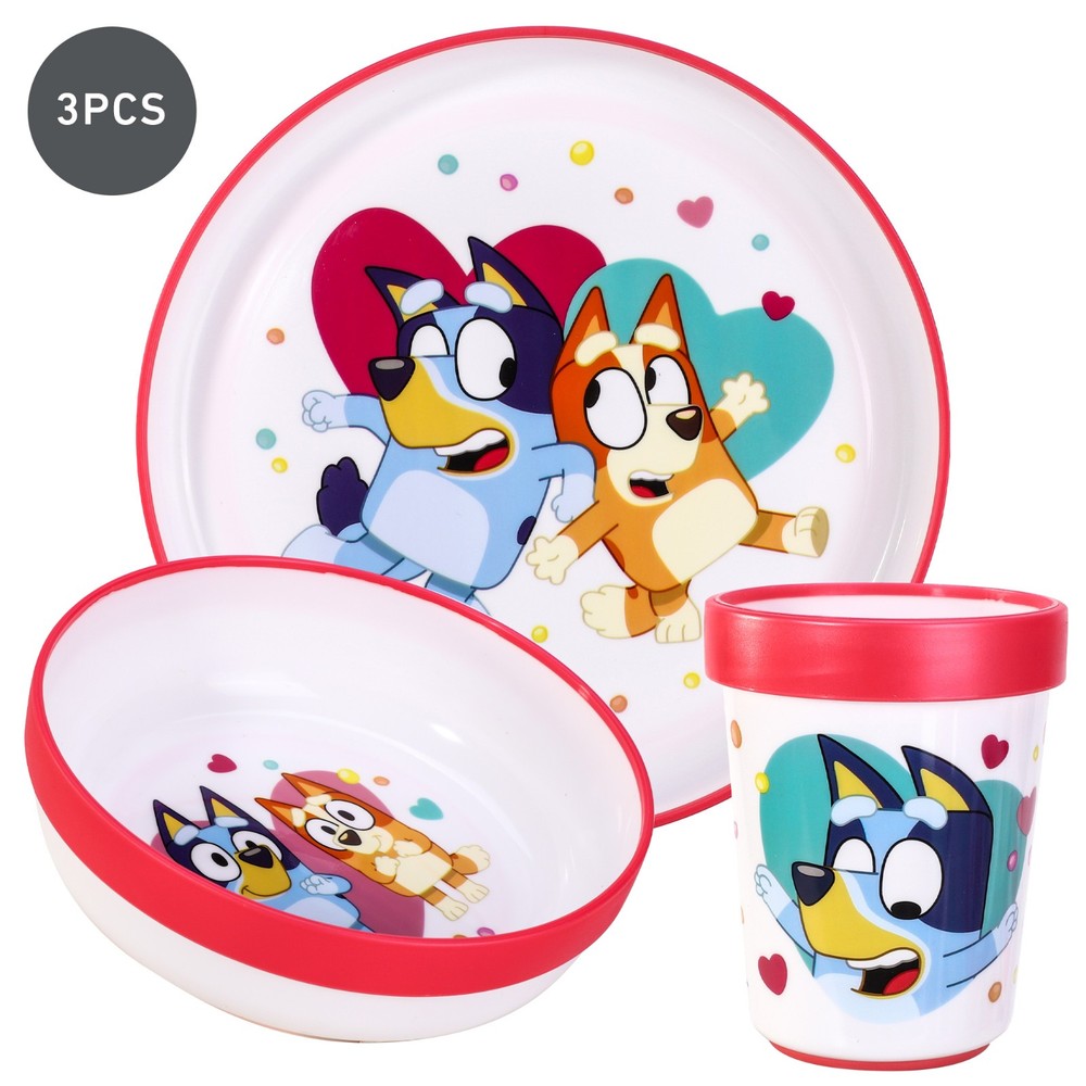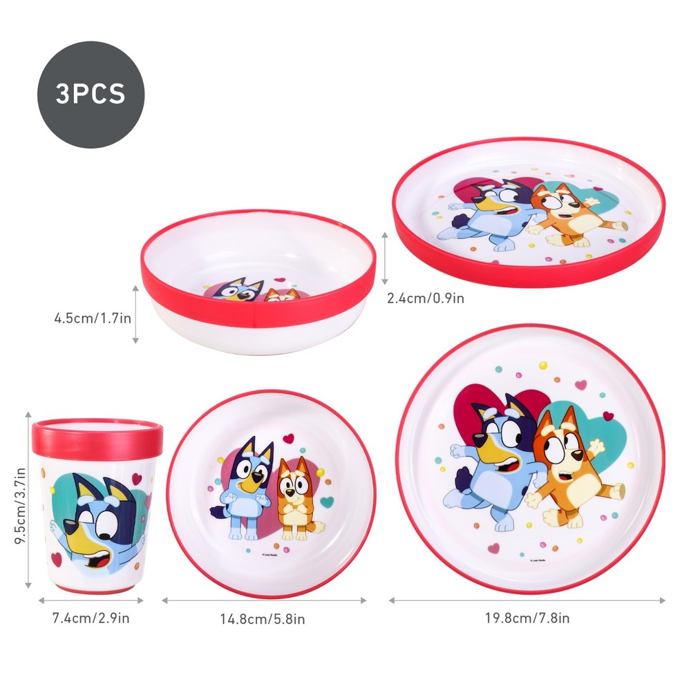 Bluey Pink 3pcs Bicolor Premium Kids Dinner Tableware Set Plate, Bowl & Tumbler, BPA Free MEALS ARE FUN WITH FAVOURITE CHARACTERS: Our dining sets have kid’s favourite cartoon characters printed on them which makes meals fascinating and fun. Cute cartoon prints can encourage your little ones more to eat on their own. COMPREHENSIVE SET FOR ANY MEAL: This fascinating dinner set includes decent size plate bowl and tumbler. Be it breakfast or dinner, Our dining set has everything your little one needs to enjoy the meal! 100% SAFE AND ENVIRONMENT FRIENDLY: This dinnerware set is certified food safe (US/EU) and 100% BPA, harmful toxins and chemicals free. The item is Reusable and Its also 100% Recyclable which means you can throw it away without guilt when you no longer need it. DURABLE AND LIGHTWEIGHT: Our dinner set is made from high quality and eco-friendly material which can last for many years. Not only it is safe but also strong and can easily bear daily rough handling by kids. GREAT BABY SHOWER GIFT or BIRTHDAY GIFT: This children's breakfast and dinner set features a fun print, making it a great gift idea for any occasion for kids. Suitable from 3 years and above.