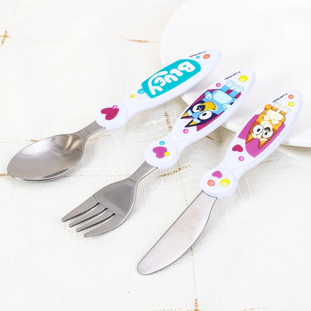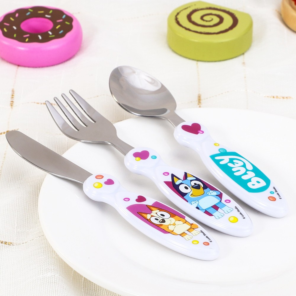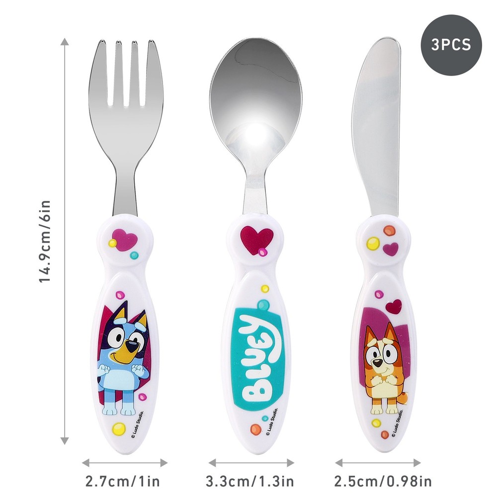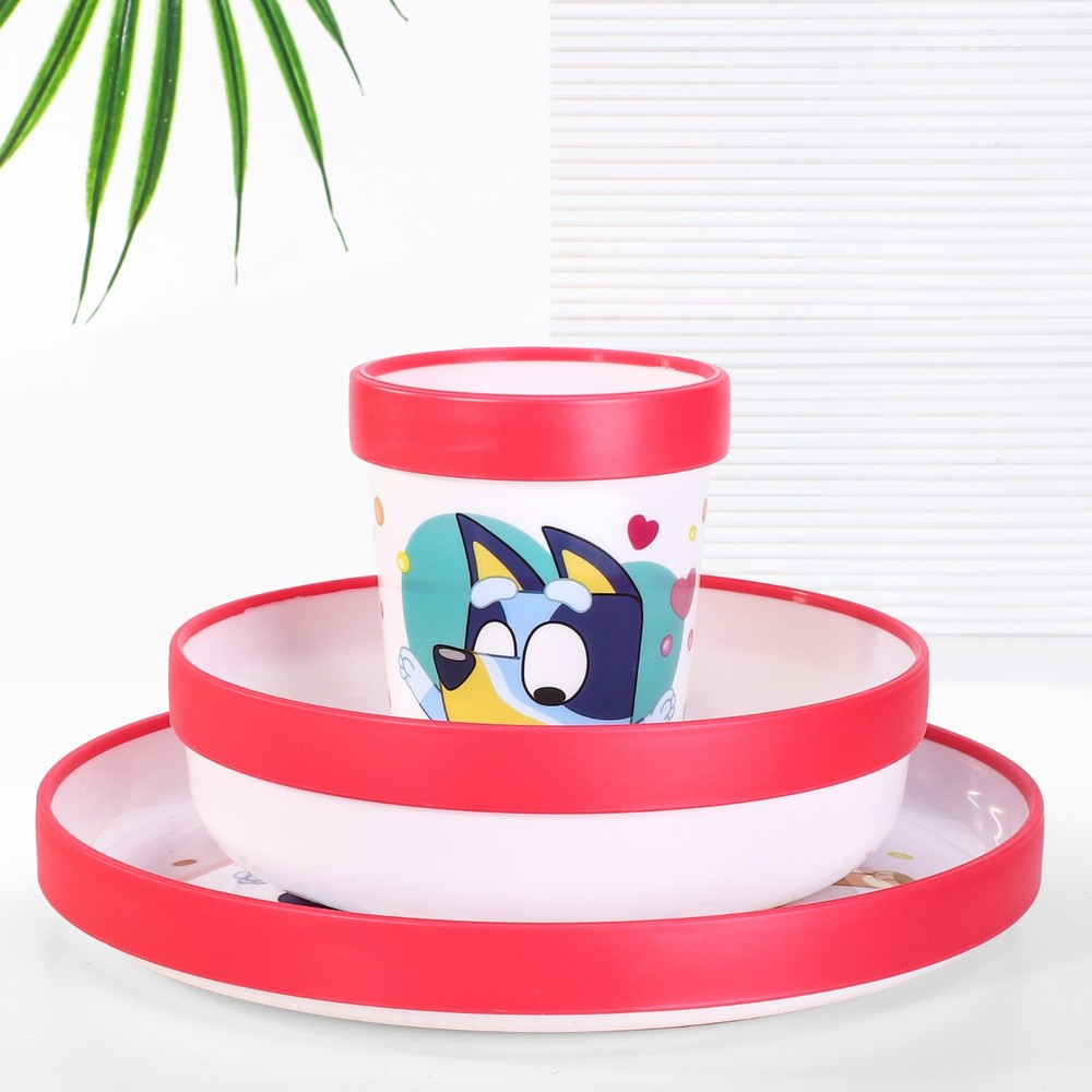 Bluey Pink Kids 6 Piece Dinner Set - Plate/Bowl/Cup/Knife/Fork/Spoon - Childrens Dinnerware Tableware Cutlery Set MEALS ARE FUN WITH FAVOURITE CHARACTERS : This 6 piece dinnerware and cutlery set has kid's favourite cartoon characters printed on it which makes meals fascinating and fun. Cute cartoon prints can encourage your little ones more to eat on their own. COMPREHENSIVE SET FOR ANY MEAL : This fascinating dinnerware and cutlery set includes decent size plate, bowl and tumbler in addition to a knife, fork and spoon. Be it breakfast or dinner, this dining set has everything your little one needs to enjoy their meal! 100% SAFE AND ENVIRONMENT FRIENDLY : This dinnerware set is certified food safe (US/EU) and 100% BPA, harmful toxins and chemicals free. Its also 100% Recyclable which means you can throw it away without guilt when you no longer need it. DURABLE AND LIGHTWEIGHT : Our dinner set is made from high quality and eco-friendly material which can last for many years. Not only it is safe but also strong and can easily bear daily rough handling by kids. GREAT GIFT IDEA : This cutlery set features a fun print, making it a great gift idea for any occasion for kids. They are all dishwasher-safe for easy clean.