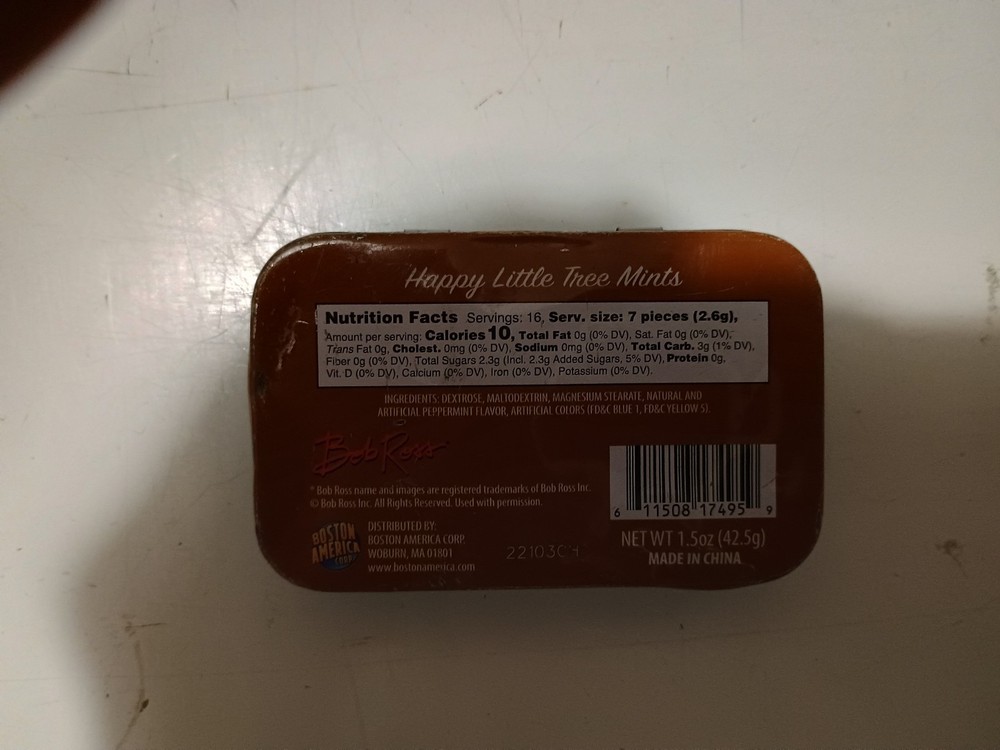 Elevate your collection with the Bob Ross Happy Little Tree Mints Can, a delightful nod to the beloved painter and his iconic style. These original Bob Ross-themed mints offer a unique fusion of art and relaxation, perfect for enthusiasts and collectors alike. Crafted with care, the mints feature the charming 'Happy Little Tree' design, bringing a touch of tranquility to any setting. This piece is a genuine product crafted in China, reflecting the quality and detail that fans of Bob Ross have come to appreciate. Whether displayed on a shelf or used to add a hint of creativity to your daily routine, this collectible can serves as a charming tribute to the legacy of Bob Ross and his enduring impact on the art world.