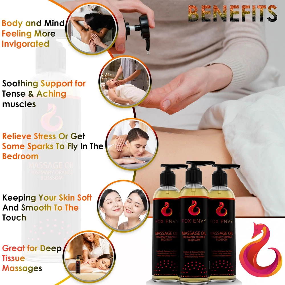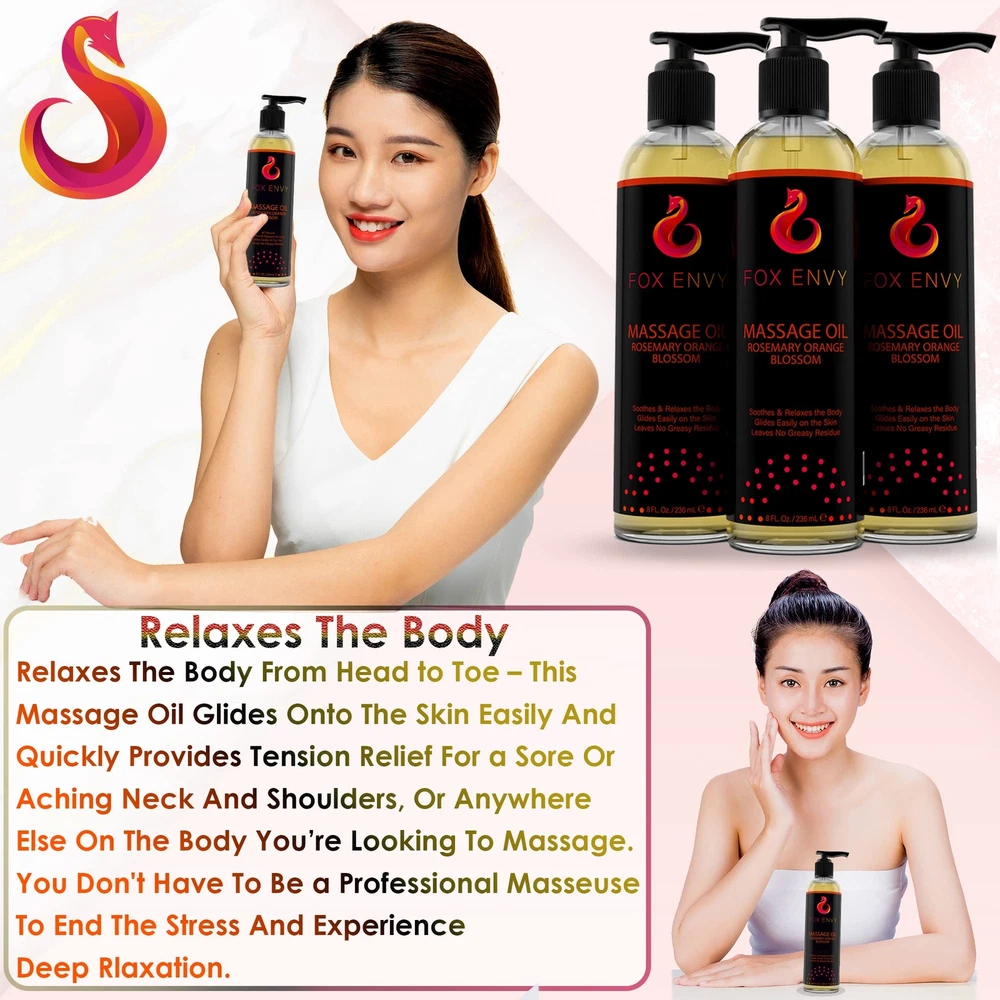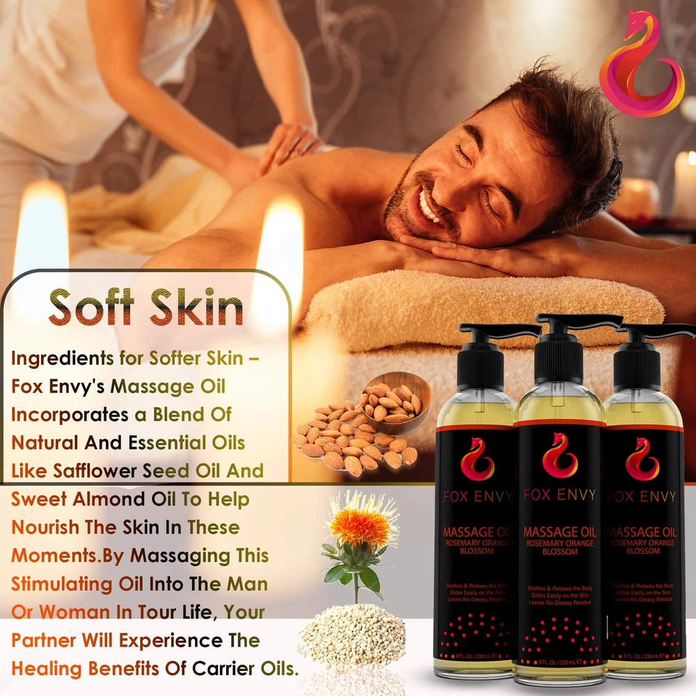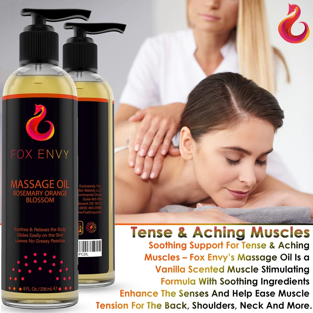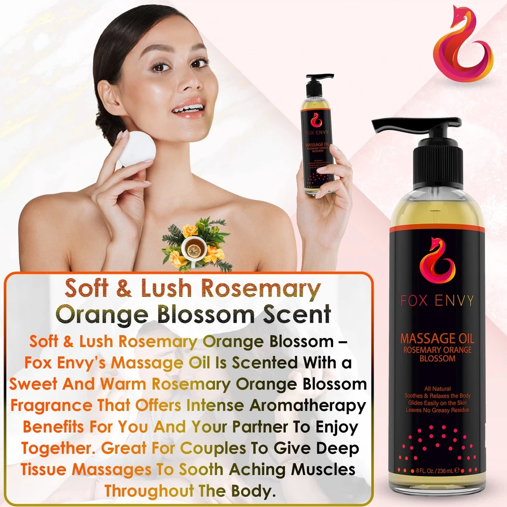 "Orange blossom with rosemary scent, ’s Massage Oil is made with soothing ingredients that enhance the senses and help ease muscle tension for the back, shoulders, neck and more. Perfect massage body oil for couples, men and women. This massage oil glides onto the skin easily and quickly provides tension for a sore or aching neck and shoulders, or anywhere else on the body you’re looking to massage. You don't have to be a professional masseuse to end the and experience deep relaxation. Formulated with the perfect combination of ingredients like sunflower oil, coconut oil, E, almond oil, orange blossom with rosemary fragrance and more, our oil is the perfect solution for your body! Our relaxing massage oil helps in nourishing and moisturizing the skin. This massage oil won’t leave behind any greasy residue, which means you don’t have to worry about your sensitive skin feeling slippery for hours after use. sore muscle massage oil helps in relieving the pain from your muscles that stop you from doing what you love! Our body massaging oil with its soothing and cooling abilities freshens the skin and its aromatic smell gives a relaxed feel. The product comes in a 8 fl Oz bottle. " RELIEVE MUSCLE TENSION: Let the of the day melt away with Body Massage Oil. This expertly crafted massage oil for neck and back provides immediate for muscle aches and tension, making it great for targeted therapy at home. Ideal for those who seek to combine relaxation with effective sore muscle massage oil treatment, enjoy the spa-quality experience without stepping outside. NOURISH AND HYDRATE SKIN: Pamper your skin with our deeply moisturizing body massage oil. Infused with a blend of jojoba massage oil, Coconut, and Sweet Almond oils, our product is the best body oil for those who value skin . Quick to absorb and enhanced with E, it leaves your skin hydrated, soft, and visibly glowing, establishing itself as an essential oil for dry skin and daily care. ENHANCE EMOTIONAL WELL-BEING: Elevate your massage into a holistic healing experience with 's body oil scented. Infused with the uplifting scent of orange blossom and the clarifying aroma of rosemary, this massage oils for massage therapy not only soothes the body but also promotes clarity and calmness. It's an exceptional choice for alleviating and enhancing mood, making every massage session a rejuvenating journey for both body and mind. LUXURIOUS ORANGE BLOSSOM AND ROSEMARY AROMA WITH QUICK ABSORBING FORMULA: Revel in the refined and invigorating scent of orange blossom paired with rosemary in our luxurious oil for body massage. Crafted for a non-greasy, swift-absorbing application, it's ideal for massage therapy, leaving no residue behind. This formula ensures a smooth, comfortable massage experience that caters to all skin types, from oily to sensitive. SUITABLE FOR ALL SKIN TYPES AND FREE FROM GREASY RESIDUE: Body Massage Oil is a comprehensive solution for everyone. Its non-greasy formula, enriched with natural body oils for women and men, ensures a clean use every time without any mess. Ideal for those who need an organic body oil for women and men that's easy to apply and beneficial for maintaining impeccable skin condition post-massage.c1c1c1